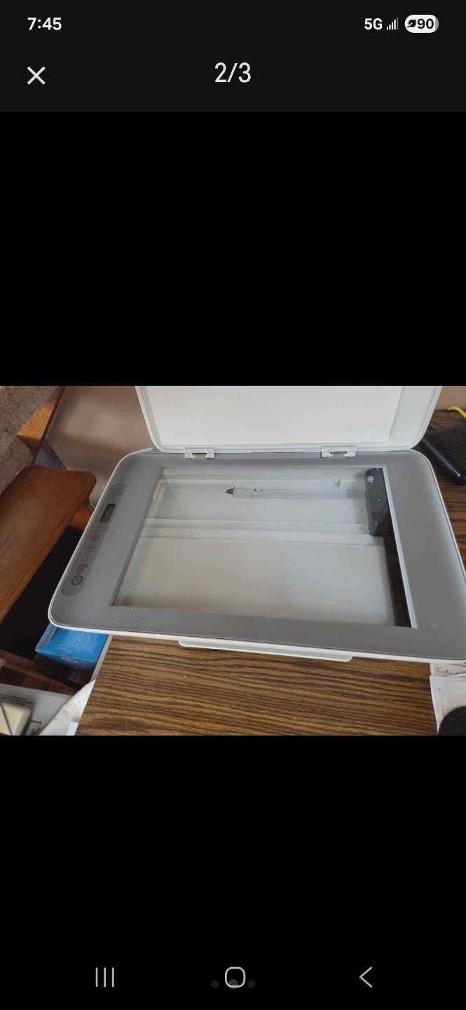 White HP DeskJet 2755 all-in-one printer. Includes one tri-colour ink cartridge and one black ink cartridge. This compact printer handles printing, scanning, and copying. It's great for small spaces!