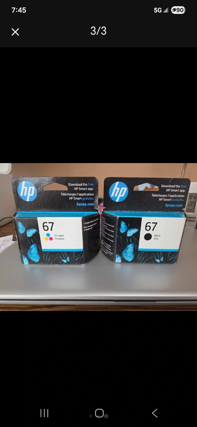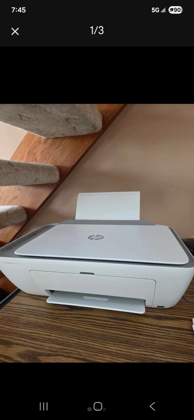 White HP DeskJet 2755 all-in-one printer. Includes one tri-colour ink cartridge and one black ink cartridge. This compact printer handles printing, scanning, and copying. It's great for small spaces!