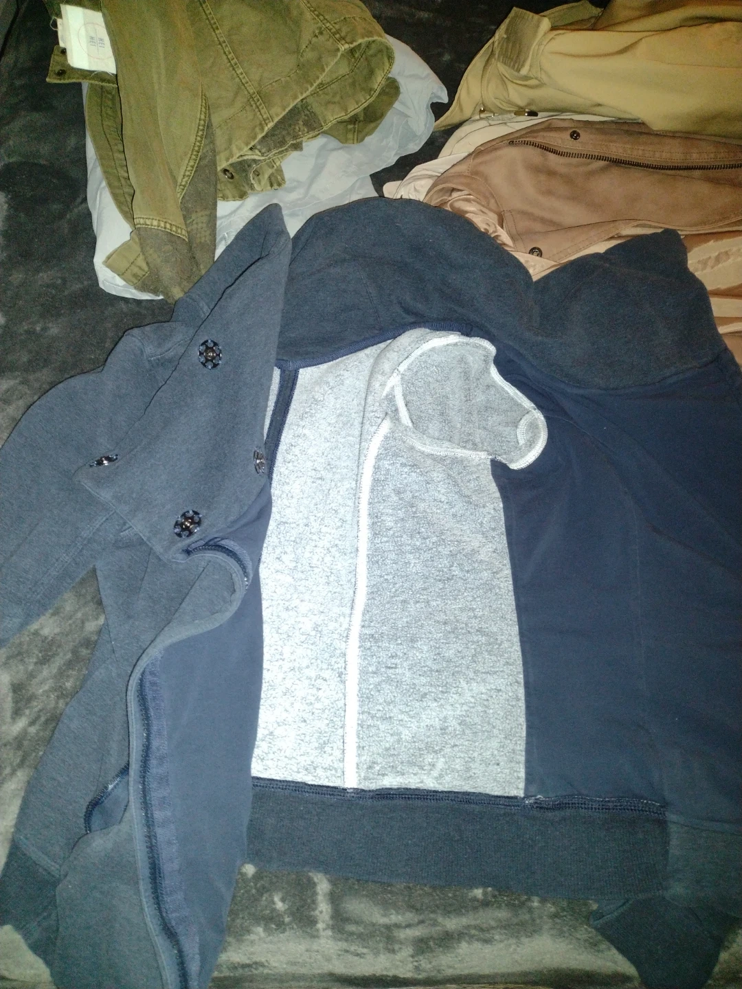 This is a navy blue zip-up hoodie with a contrasting grey inner lining and hood. It features unique button detailing on the front. The material is a soft fleece, perfect for casual wear.