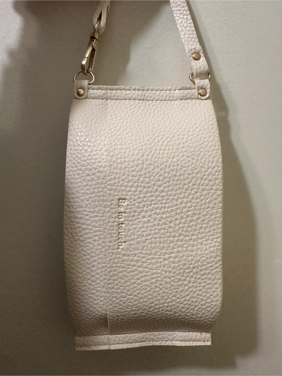 This is a Bela Touch wipe pouch made from white faux leather. It comes with a pack of PAUME cleansing hand and body wipes, containing 20 wipes. It's a convenient way to carry wipes on the go!