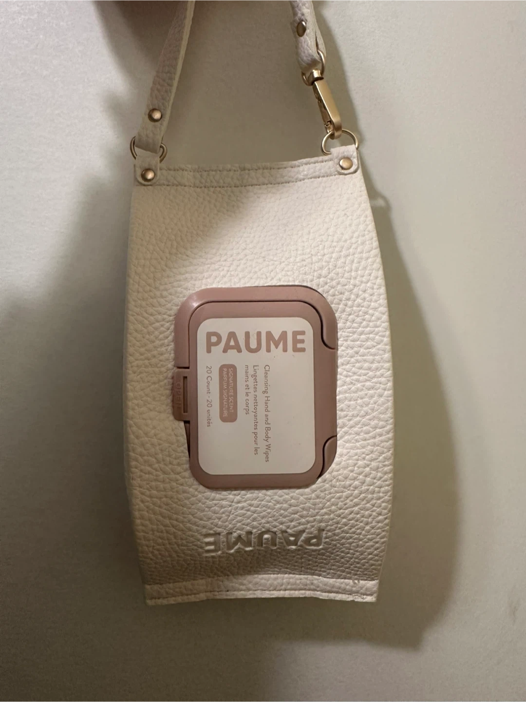This is a Bela Touch wipe pouch made from white faux leather. It comes with a pack of PAUME cleansing hand and body wipes, containing 20 wipes. It's a convenient way to carry wipes on the go!