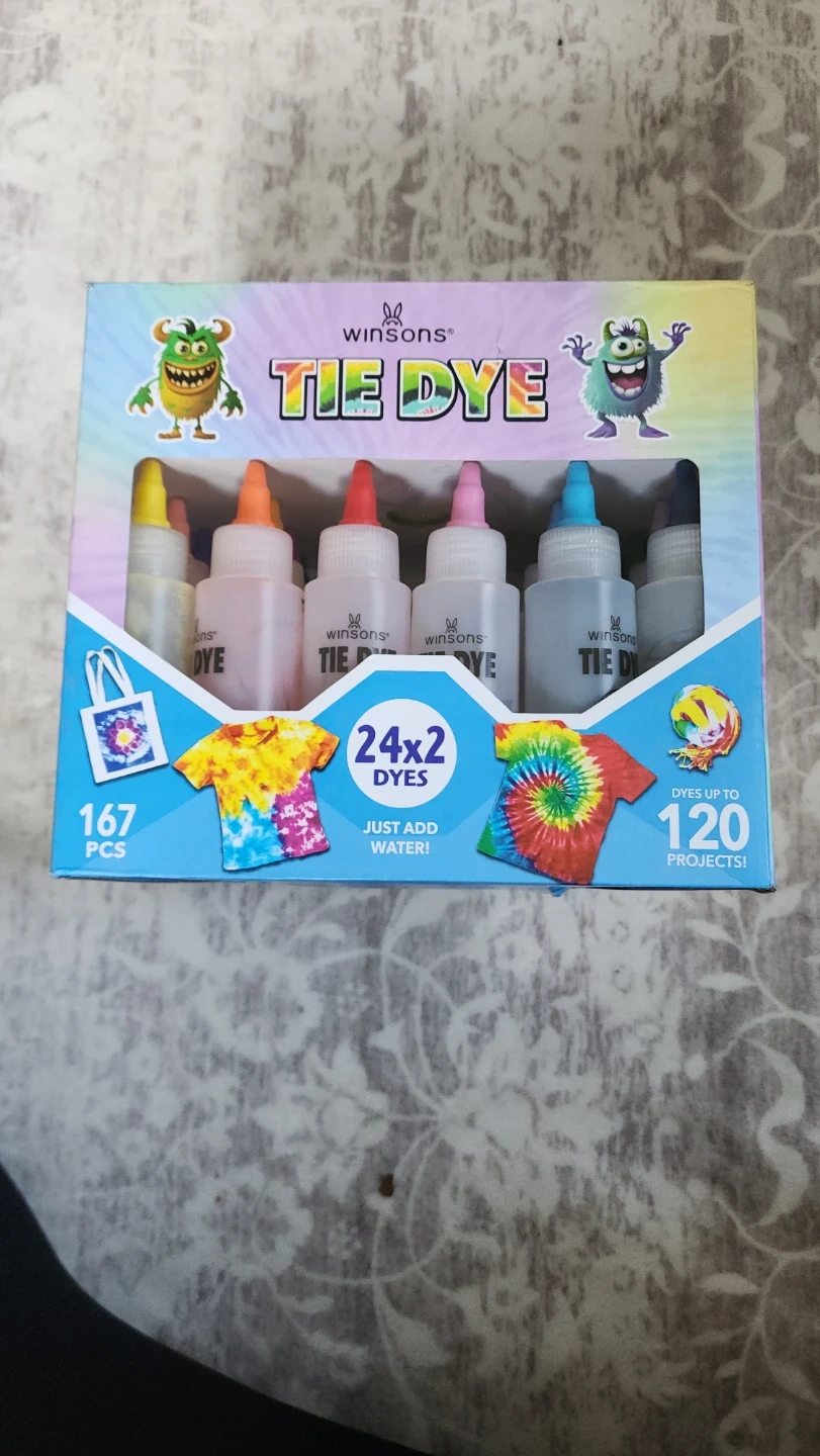 This Winsons tie-dye kit includes 24 dyes, enough for up to 120 projects. Just add water to create vibrant tie-dye designs! Perfect for crafting and DIY apparel projects.