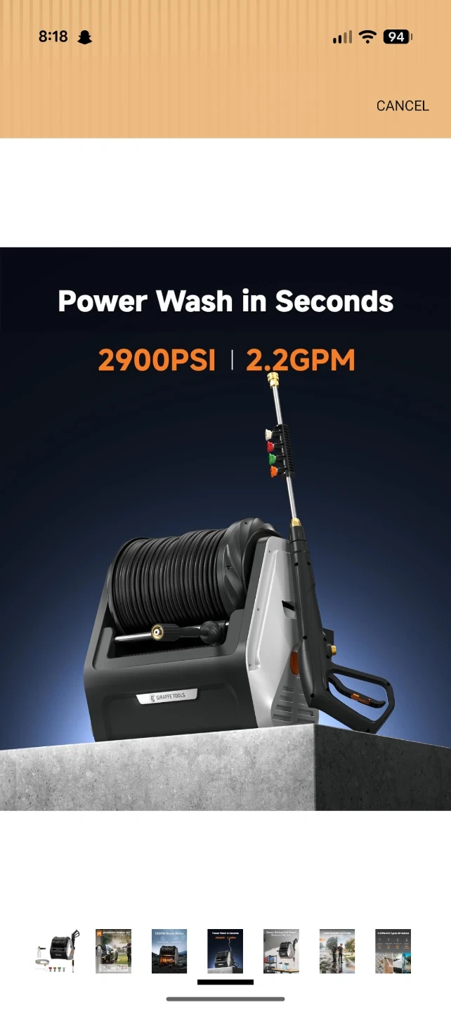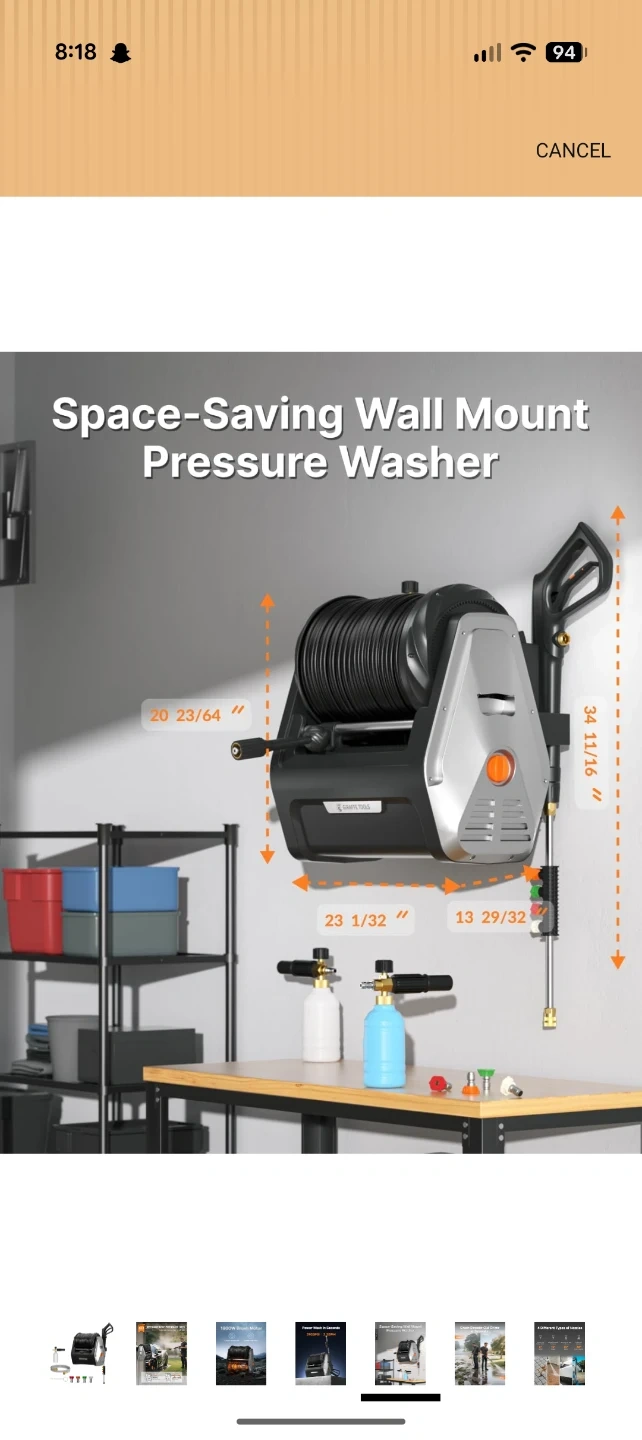 This Giraffe Tools retractable pressure washer reel offers automatic rewind and length lock. It has a 2900 PSI rating and 2.2 GPM flow rate. The unit features an 1800W brush motor for quieter operation and longer service life. It's designed for space-saving wall mounting.