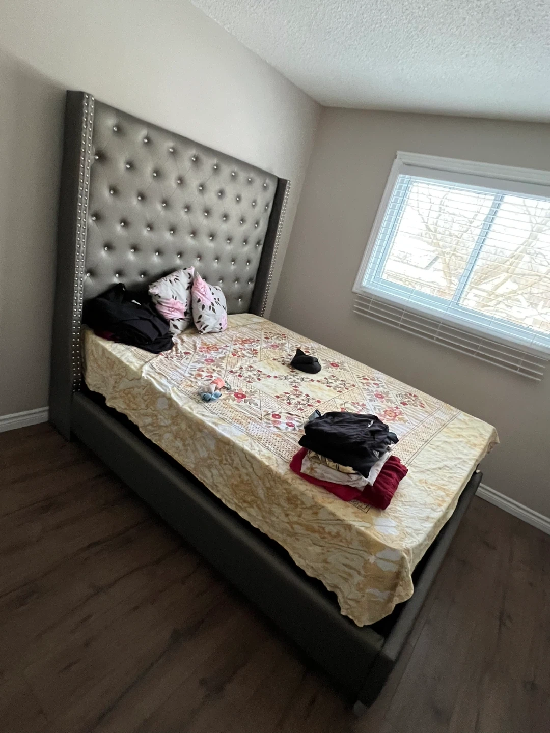 Stylish grey upholstered bed frame with a tall, tufted wingback headboard with queen size mattress. Features diamond button tufting and silver nailhead trim. Available in queen size, made with durable faux leather. Perfect for adding a touch of glam to any bedroom.