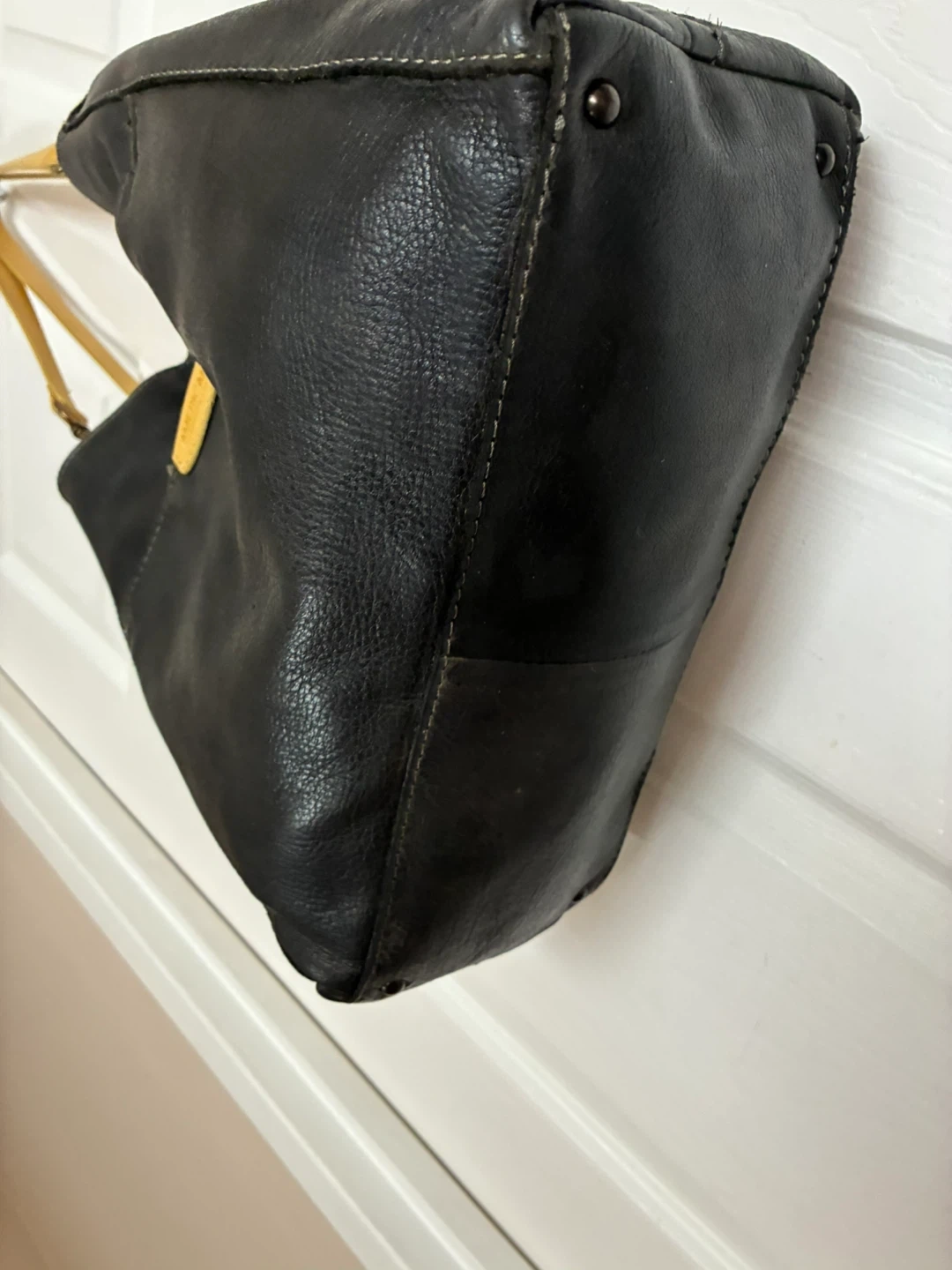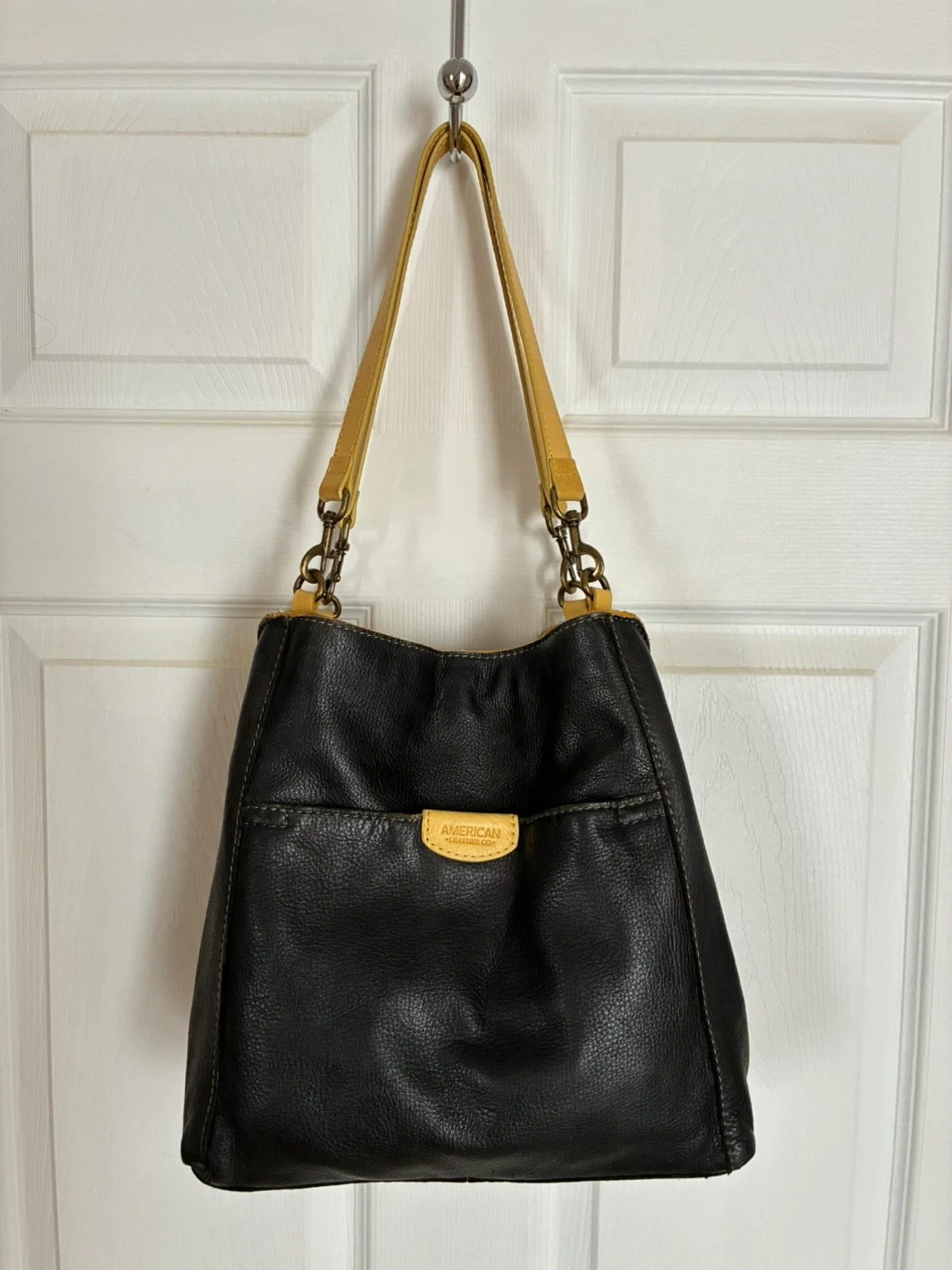 Black soft leather shoulder bag from American Leather Co. features a yellow interior and strap accents.