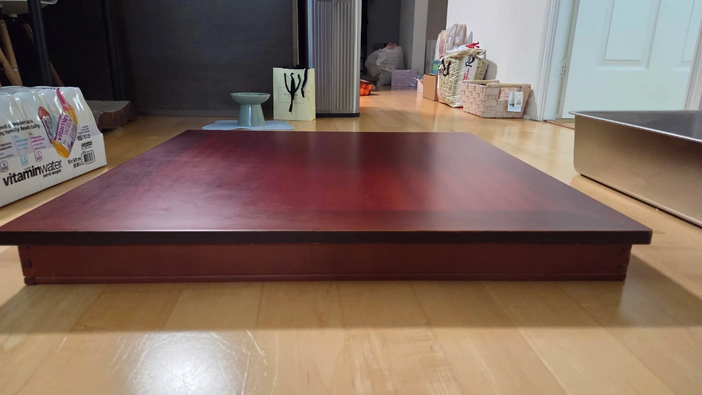 Solid wood coffee table in a dark cherry finish. It has a clean, modern design with a simple frame. Perfect for a living room or den.