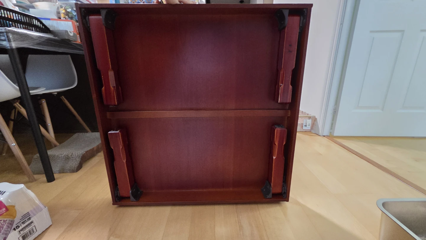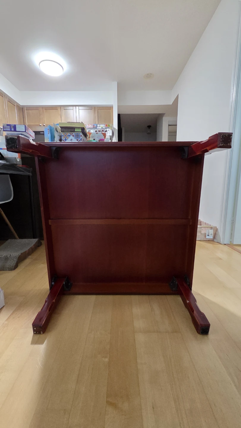 Solid wood coffee table in a dark cherry finish. It has a clean, modern design with a simple frame. Perfect for a living room or den.