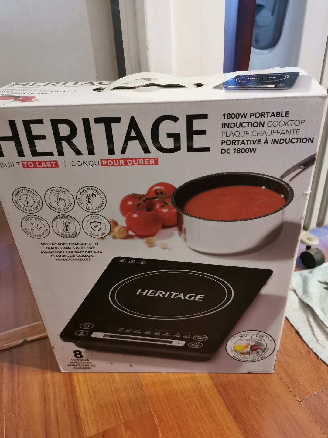 This is a Heritage 1800W portable induction cooktop. It features 8 cooking functions. The unit is easy to clean and heats up quickly. Brand New. Canadian tire selling 100 plus tax.