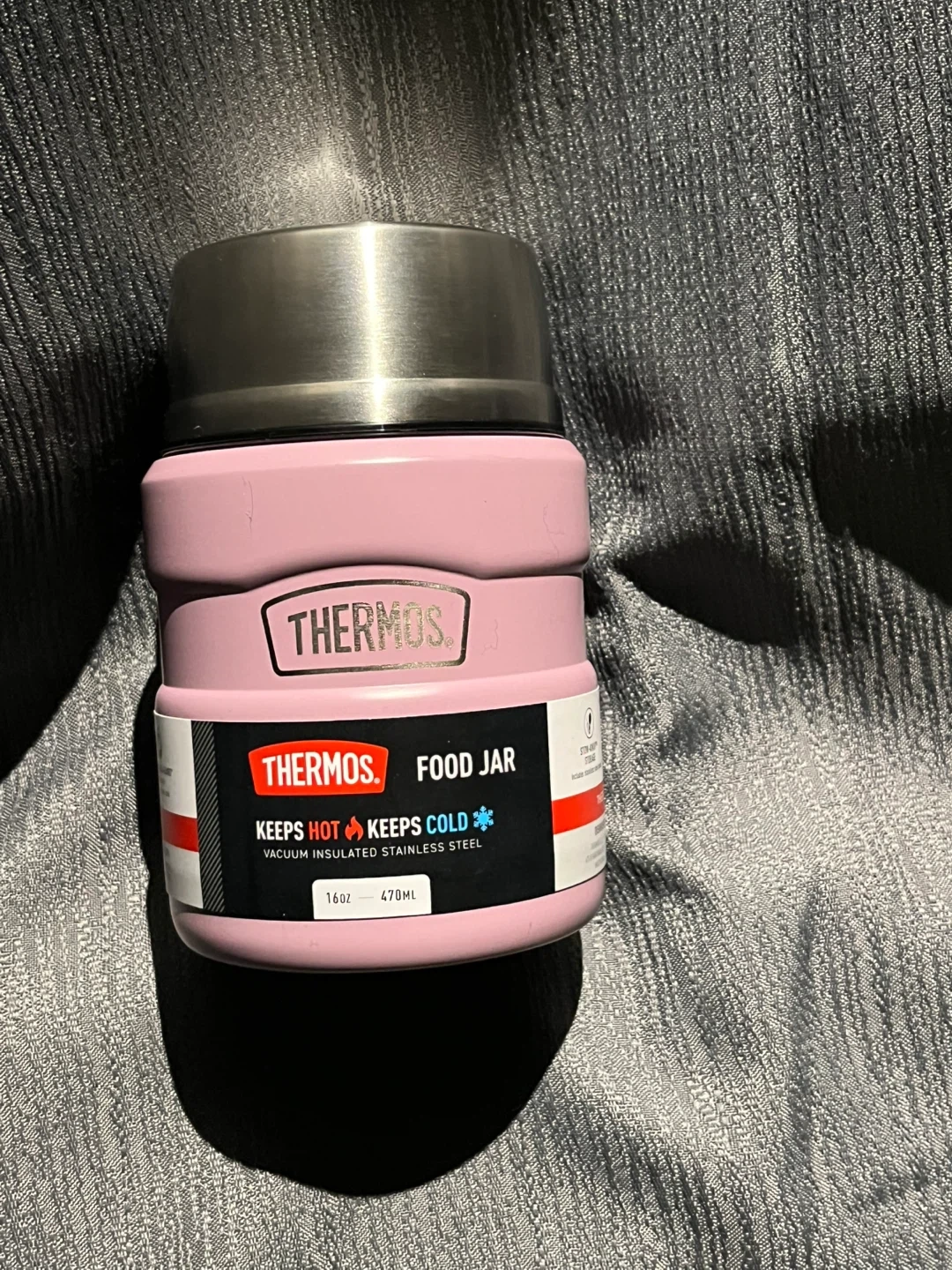 Thermos food jar in pink. Keeps hot or cold for hours. Vacuum insulated stainless steel construction. 16oz capacity. Perfect for packing lunches or snacks on the go!