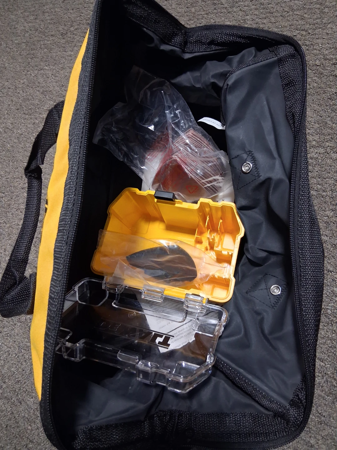 This bag DeWalt accessory kit includes various sanding pads 25 unit and abrasives. It comes with a storage case and a carrying bag for convenience. These accessories are useful for sanding and grinding tasks.