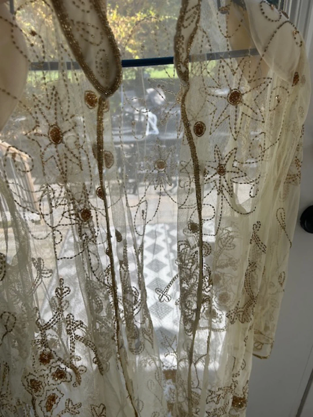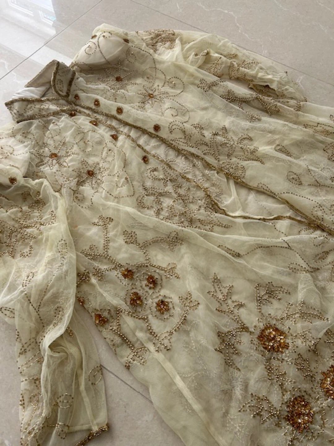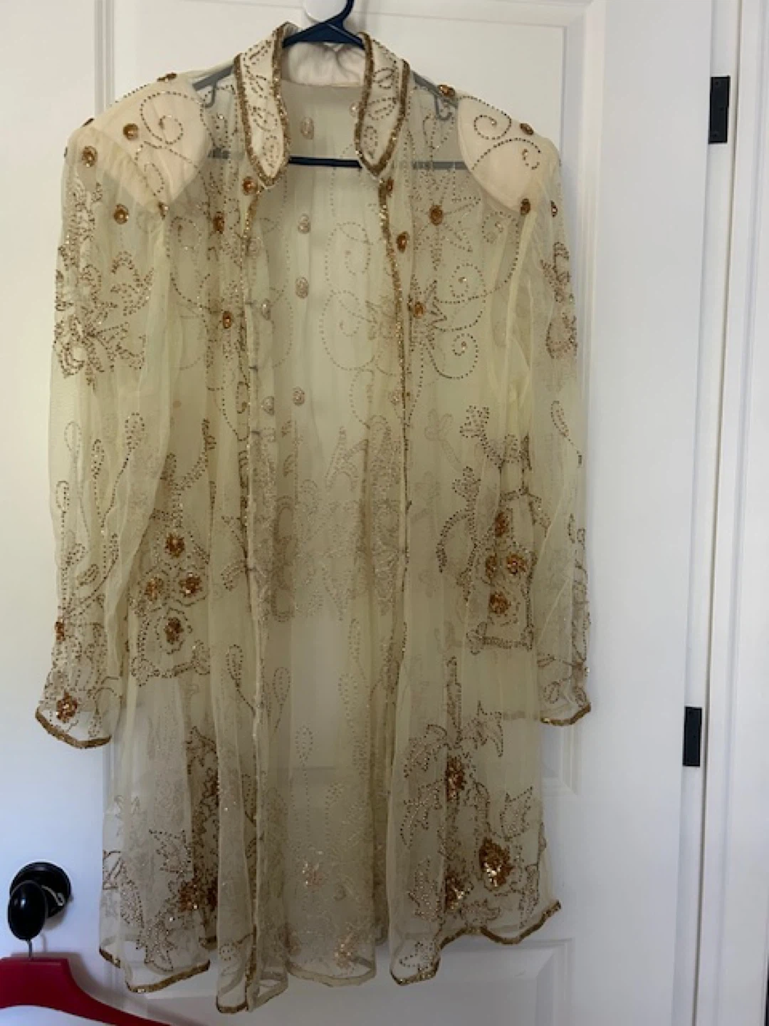 This is a beautiful cream coloured cardigan with gold embroidery. It's a lightweight and elegant piece, perfect for layering or adding a touch of sophistication to any outfit. Feel free to message me with any questions! Silk sequenced jacket
