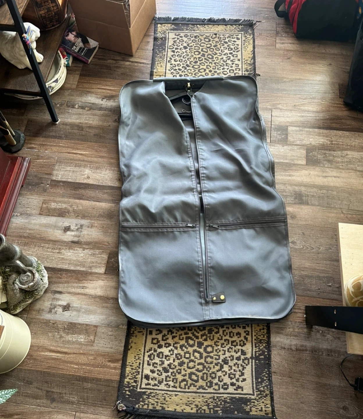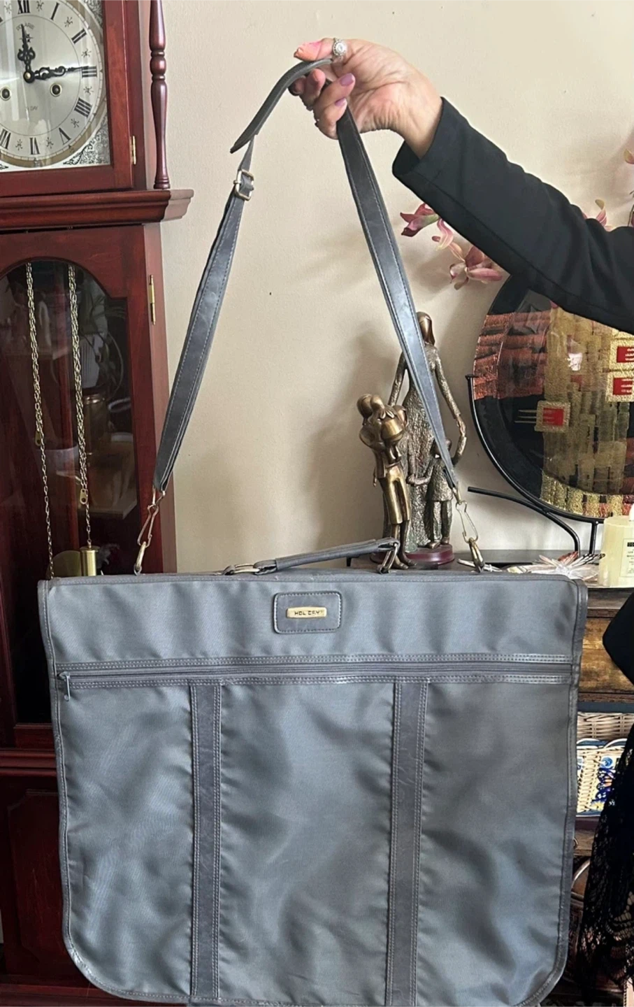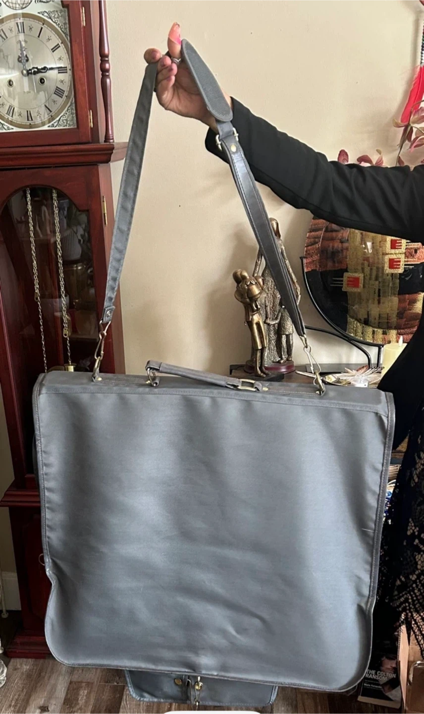 Moleskine garment bag in a sleek grey colour. It's in great shape and ready to keep your clothes wrinkle-free while you travel! Perfect for suits, dresses, or any delicate items you want to keep protected.
