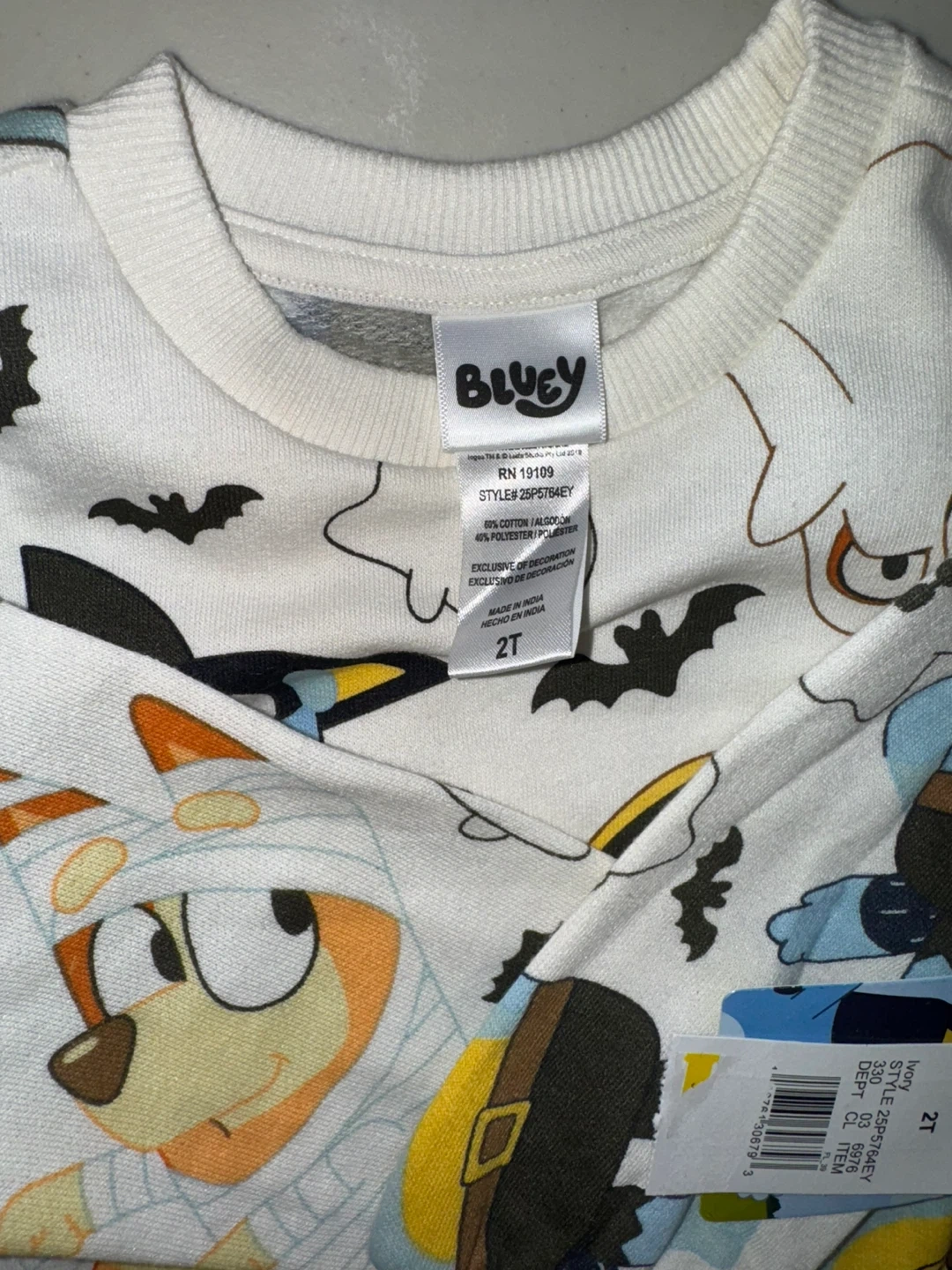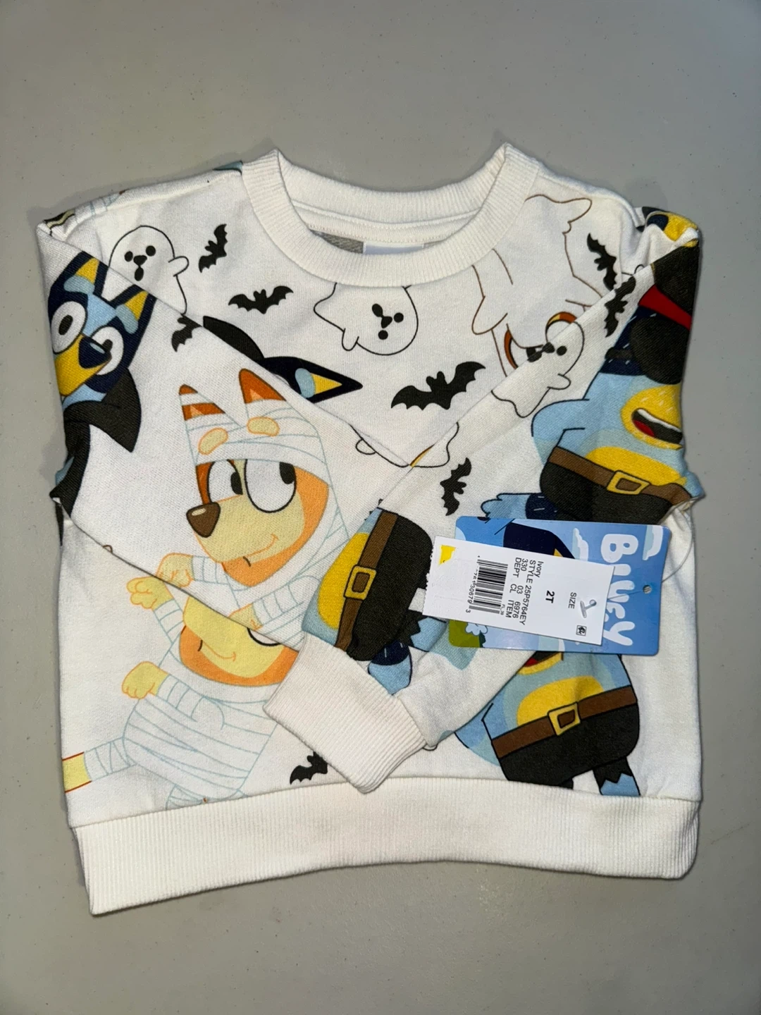 Bluey themed sweatshirt with a fun Halloween print featuring ghosts and bats. It's a size 2T. Made of 60% cotton and 40% polyester.