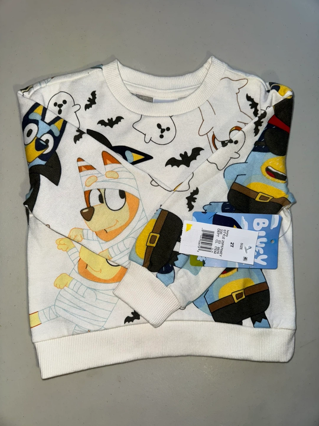 Bluey themed sweatshirt with a fun Halloween print featuring ghosts and bats. It's a size 2T. Made of 60% cotton and 40% polyester.