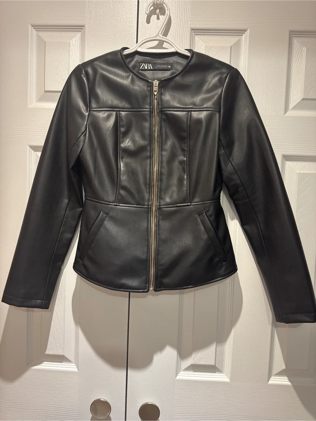Black faux leather biker jacket by Zara. It has a zip-up front and a tailored fit. Material is polyester with a polyurethane coating.