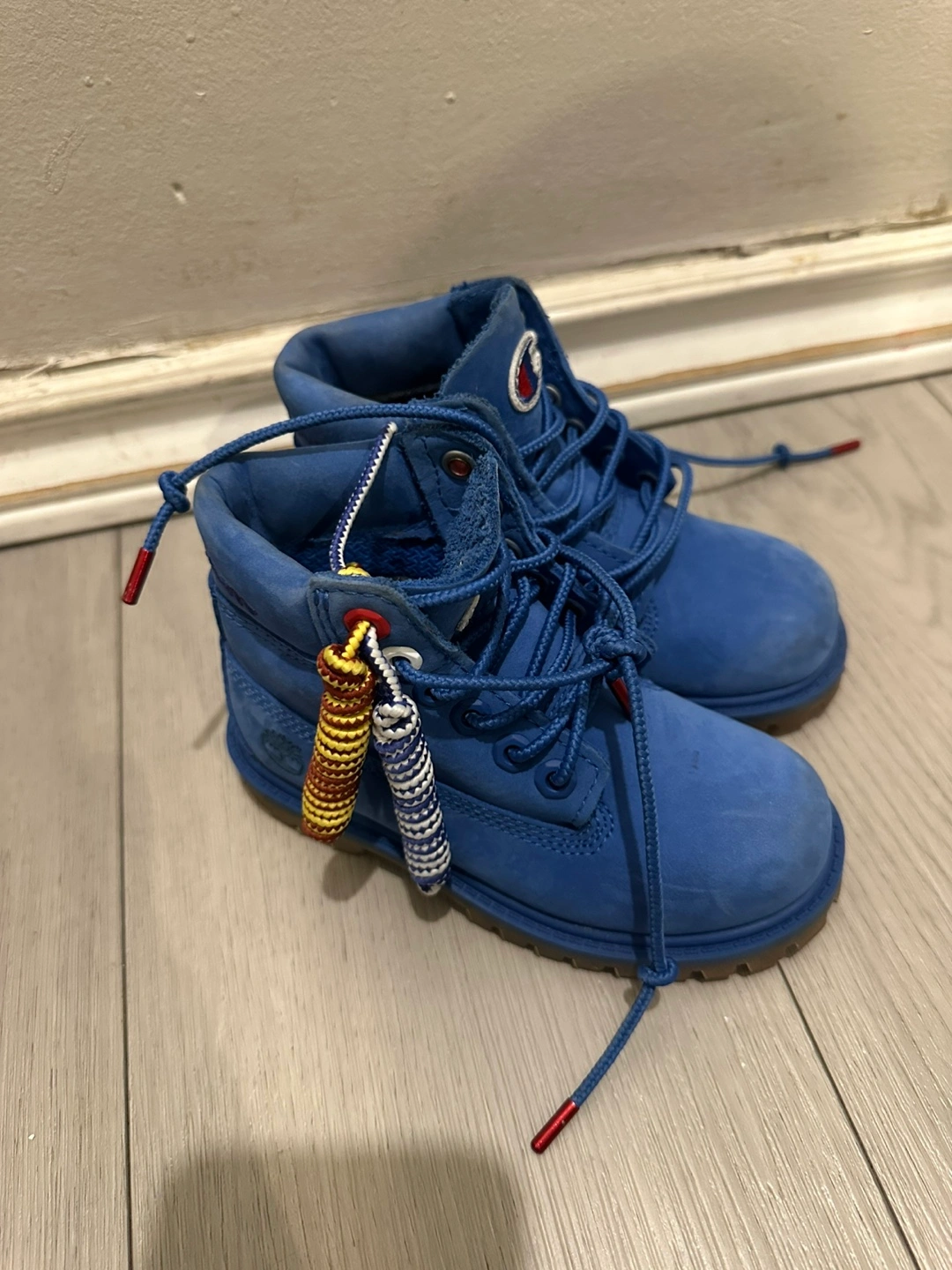 Size 9 Blue Timberland boots for toddlers. These durable boots feature lace-up fronts and side zippers for easy on and off. Perfect for keeping little feet warm and dry!