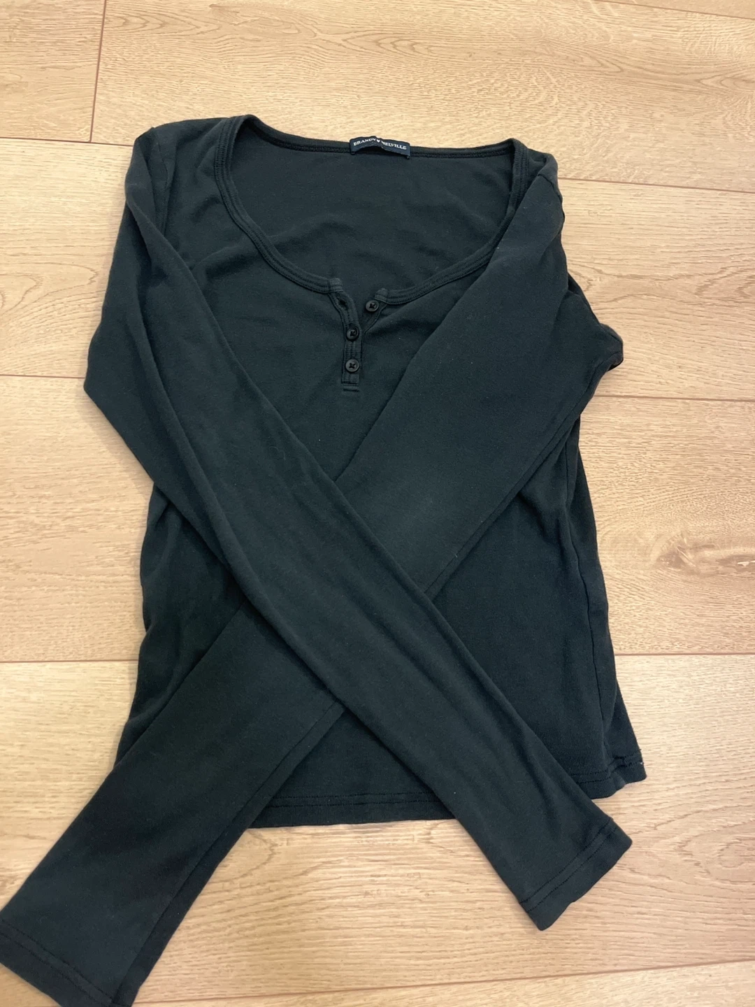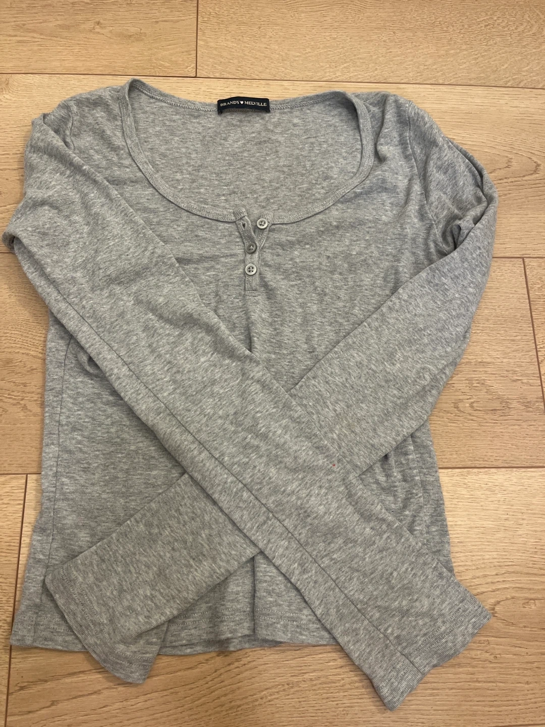 Bundle of four t-shirts. Includes two Brandy Melville long sleeve henleys, one Hollister ribbed black t-shirt, and one Brandy Melville grey marled t-shirt. Cotton blend material.