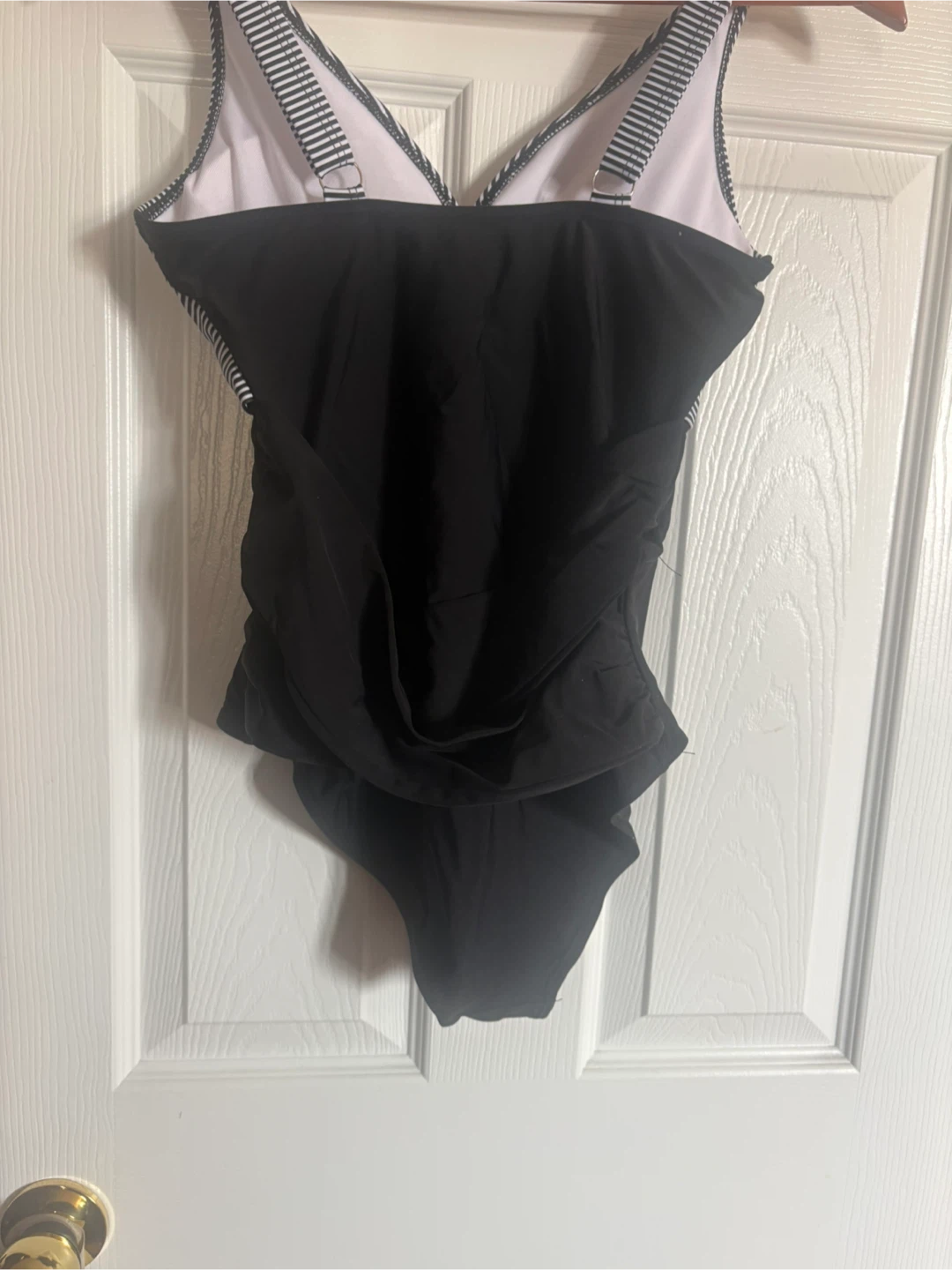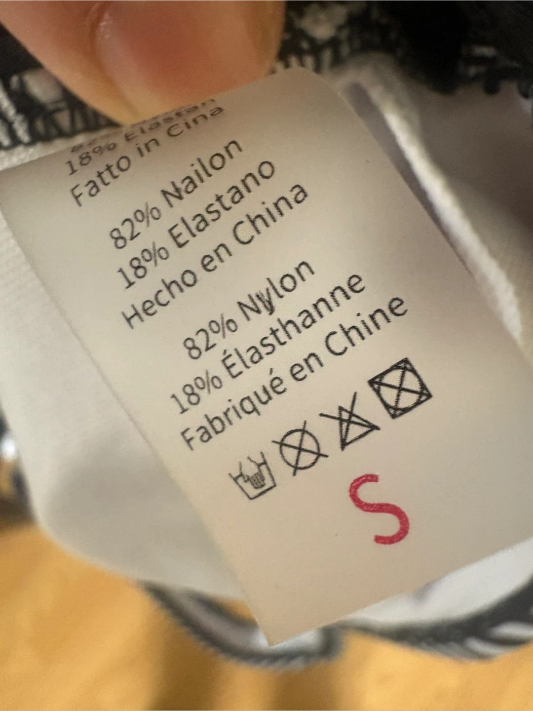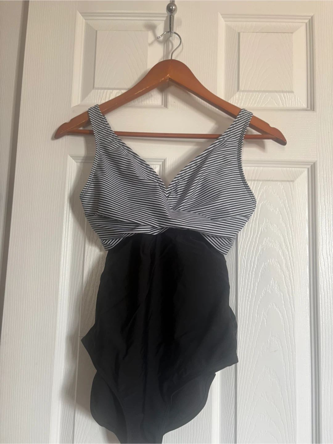 This is a women's swimsuit with a striped top and black bottom. It's made of 82% nylon and 18% elastane. Size is small.