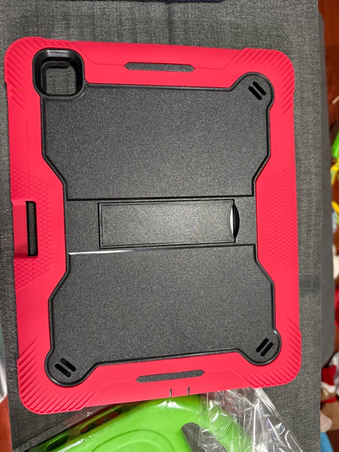 This sturdy green tablet case is designed for kids and features a built-in handle for easy carrying. It provides robust protection for your tablet. Made from durable, shock-absorbent material.