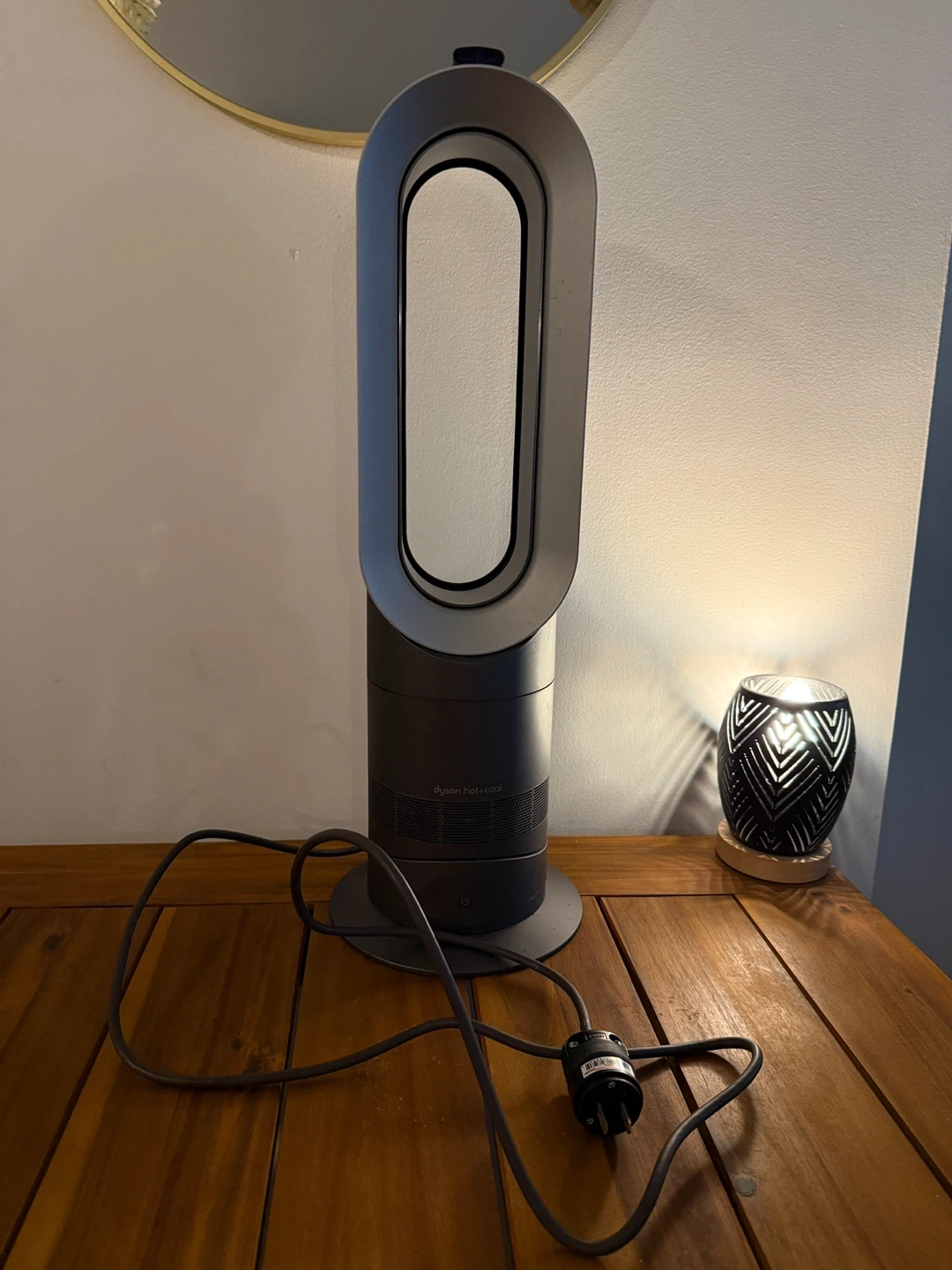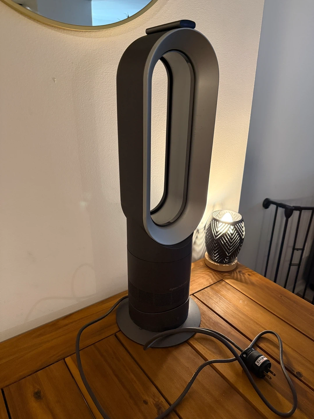 This Dyson Hot+Cool fan heater effectively heats or cools a room. It includes a remote for easy control. This unit provides efficient airflow for year-round comfort.