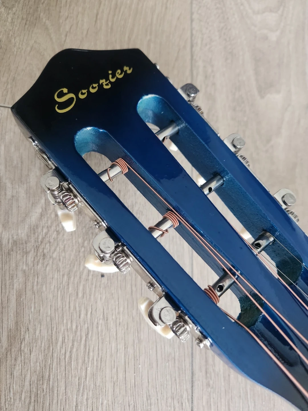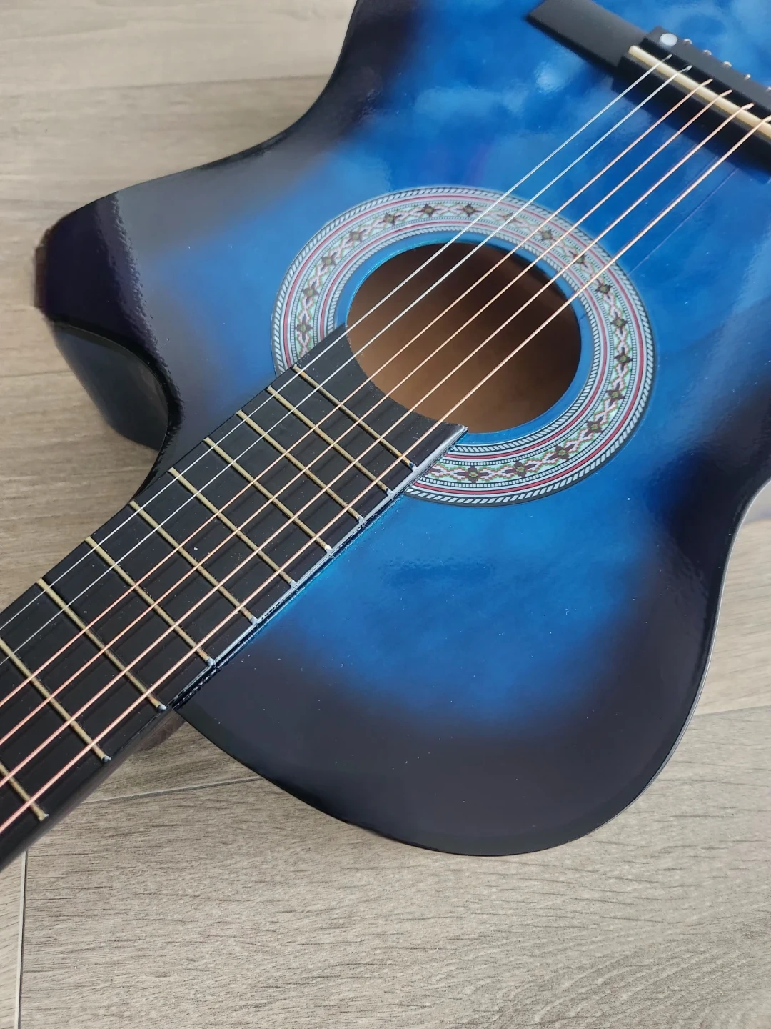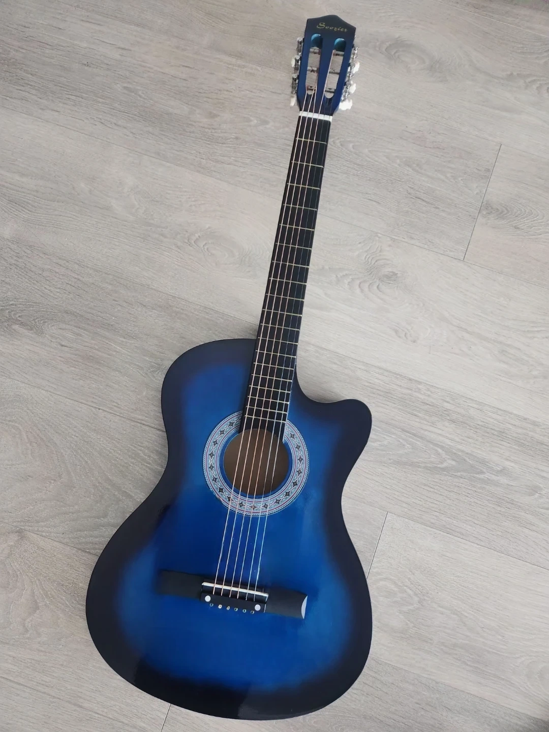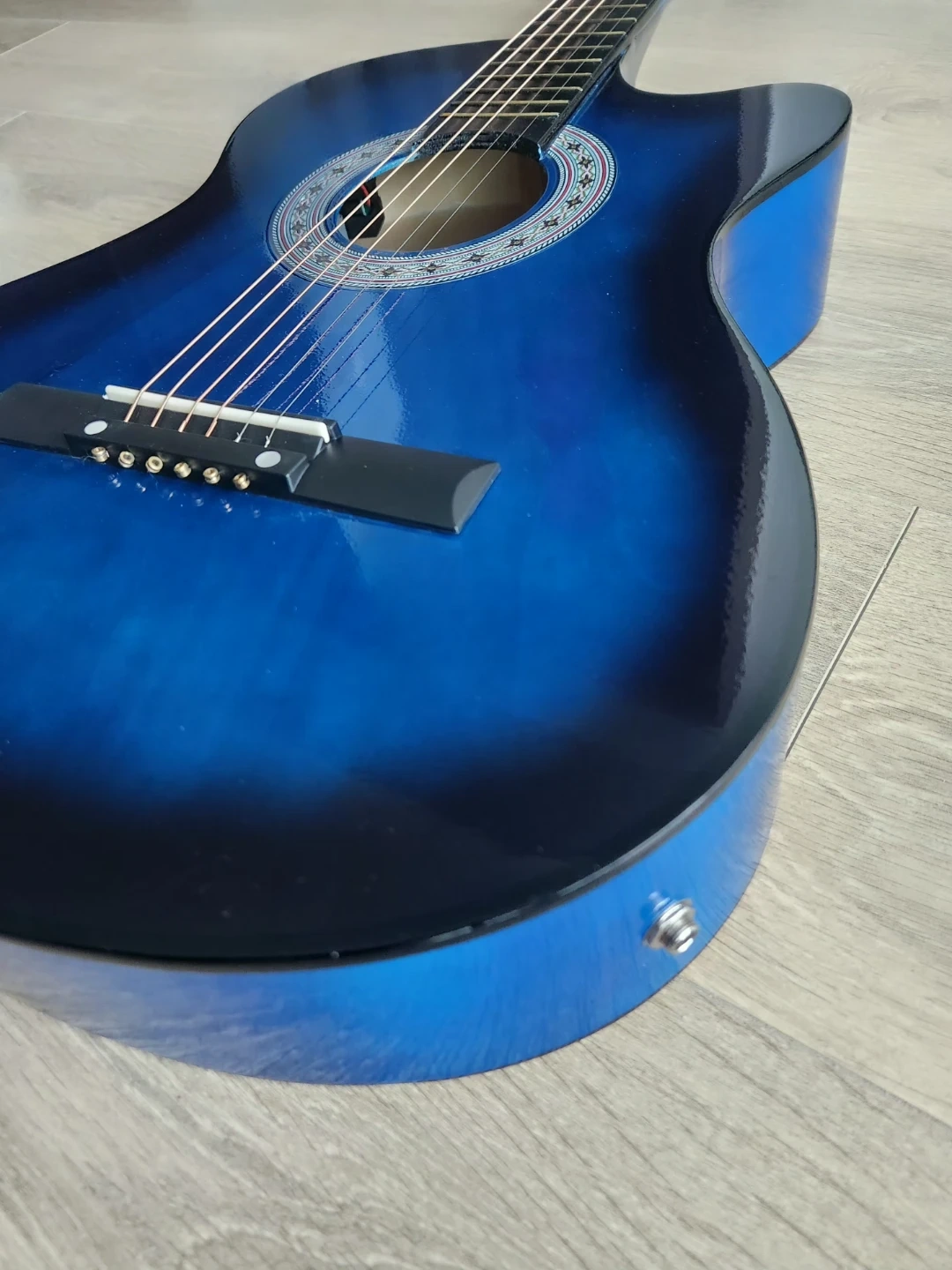 This is a BRAND NEW blue acoustic-electric guitar with a cutaway body. It features onboard EQ controls for volume, bass, mid, and treble. A great starter instrument for aspiring musicians!