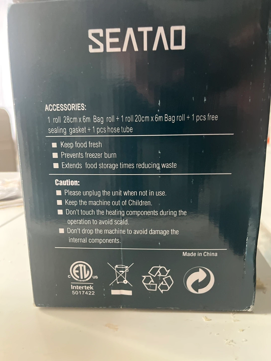 SEATAO vacuum sealer with double pump and double heating wire. It includes one roll 28cm x 6m bag roll, one roll 20cm x 6m bag roll, and one sealing gasket. It can continuously vac & seal more than 200 cycles without overheating. This machine is great for keeping food fresh and preventing freezer burn!