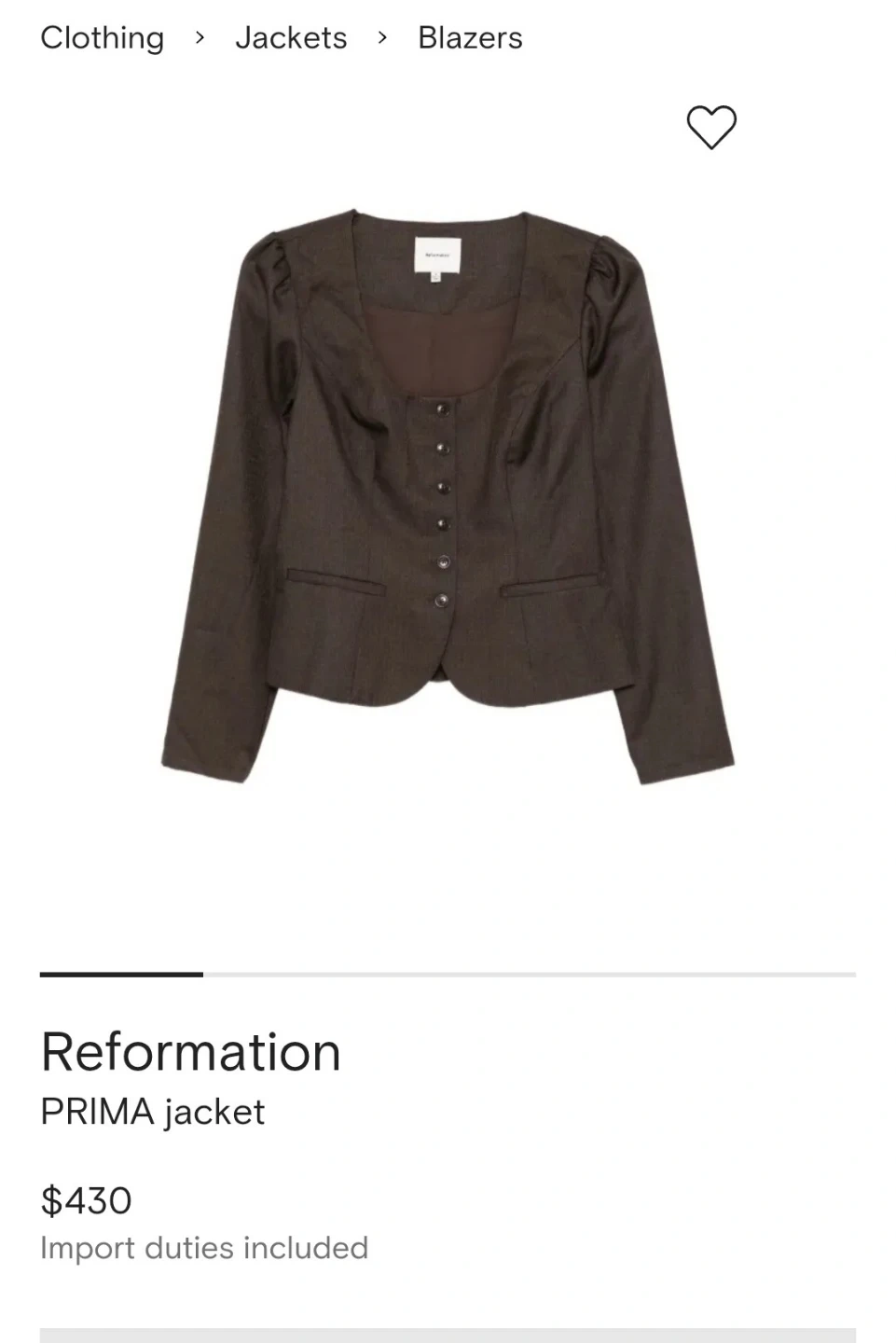 Buy & SellReformation Blazer Size 12Reformation Blazer Size 12$50Brand New Reformation blazer. Pick up downtown ConditionNewSize12WHERE TO MEETBreka Bakery & CaféView MapSELLERRinaW End341 review0 chats·0 favorites·9 viewsSEND CHAT TO SELLERHi Rina! I’m interested in your listing.Hi Rina! I’m interested in your listing.Get the Karrot app to chatSign In to chat