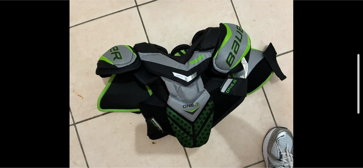 Selling Bauer Supreme ONE.6 hockey shoulder pads. They are black, gray, and green. Perfect for protection on the ice!