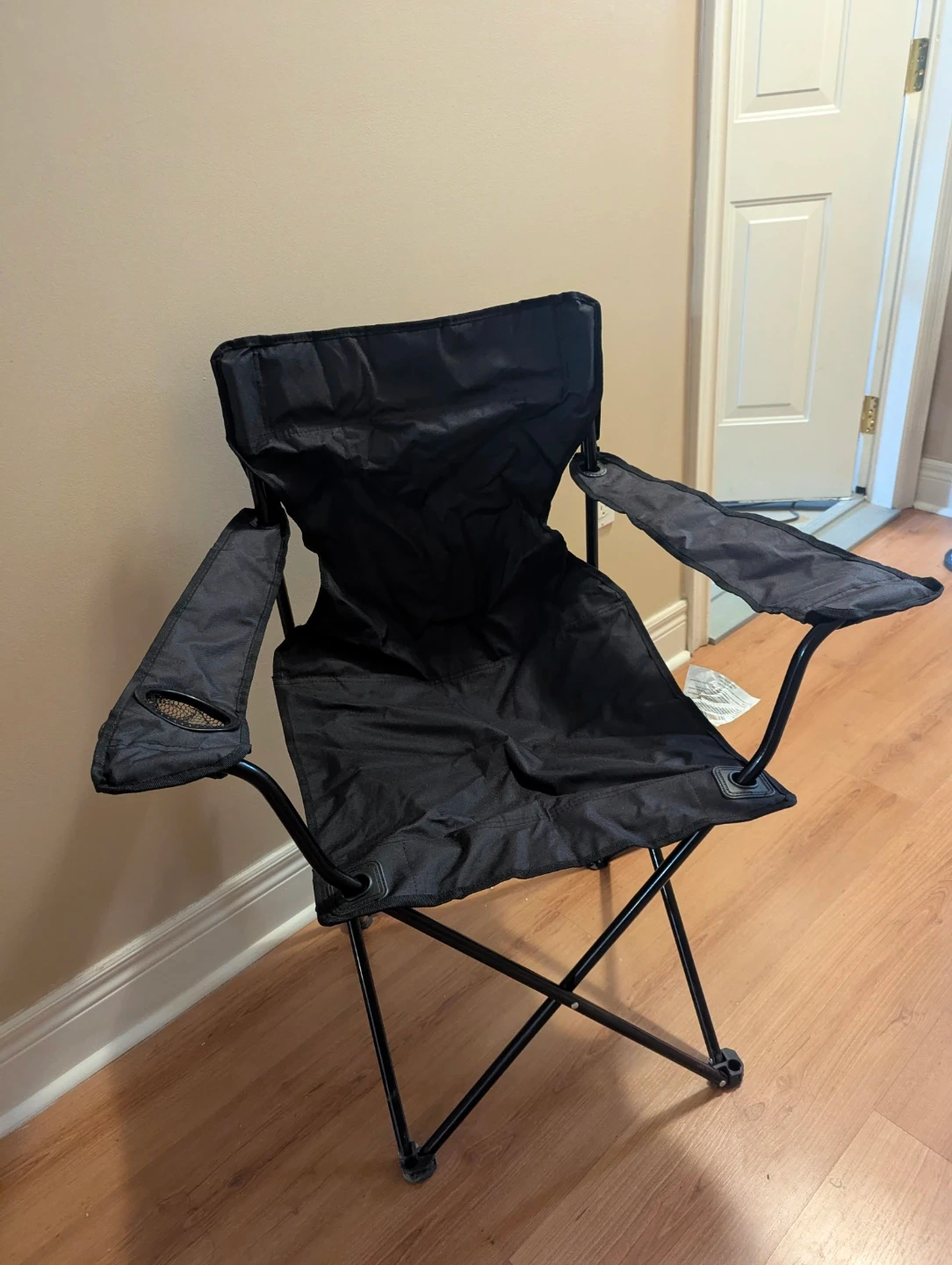 This Ozark Trail folding camp chair is black and comes with a carrying bag. It's made with fabric and a metal frame. Bring it along for camping trips or outdoor events!