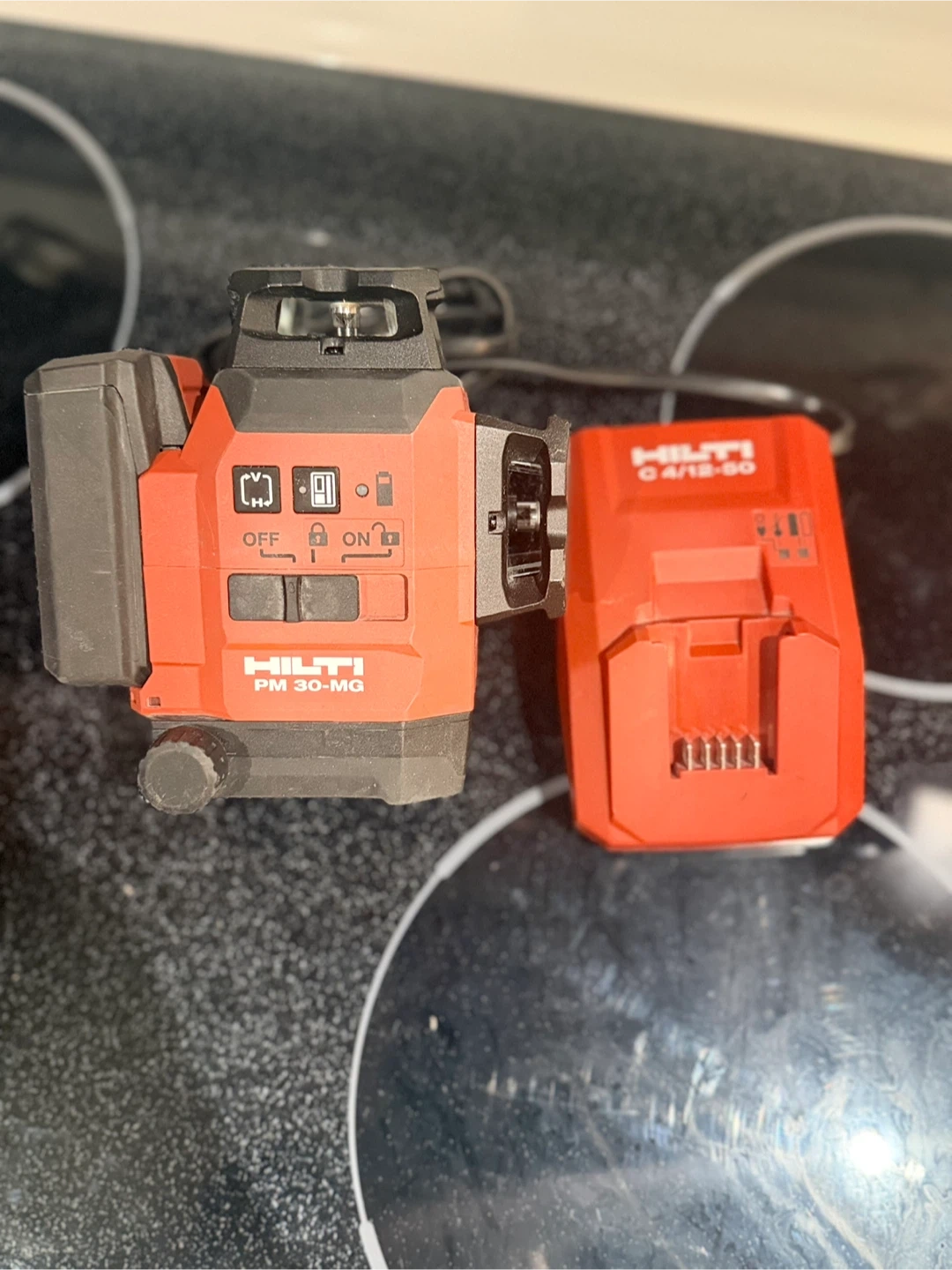 Hilti PM 30-MG laser level with a rechargeable battery. It's green laser technology. This tool is for precise alignment and measurement on construction sites. Tool has been used once .