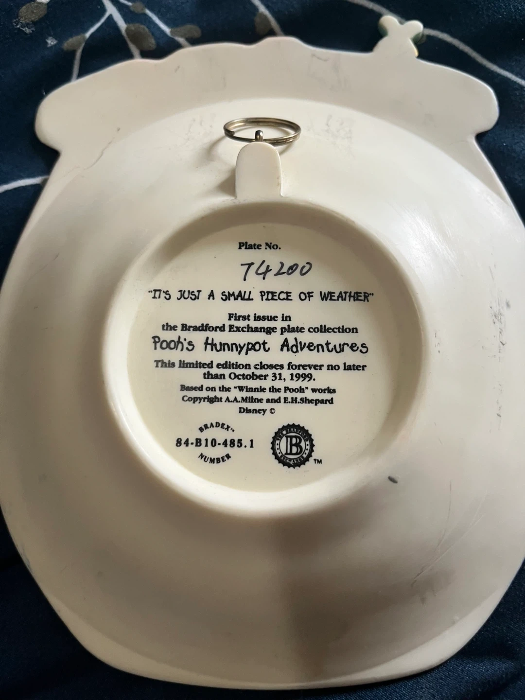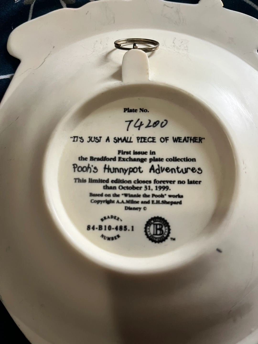 This is the first issue in the Bradford Exchange plate collection, Winnie the Pooh's Hunny Pot Adventures. It's based on the "Winnie the Pooh" works. This limited edition plate closes forever no later than October 31, 1999. It features Winnie the Pooh, Tigger, Piglet, and Eeyore under an umbrella in the rain.