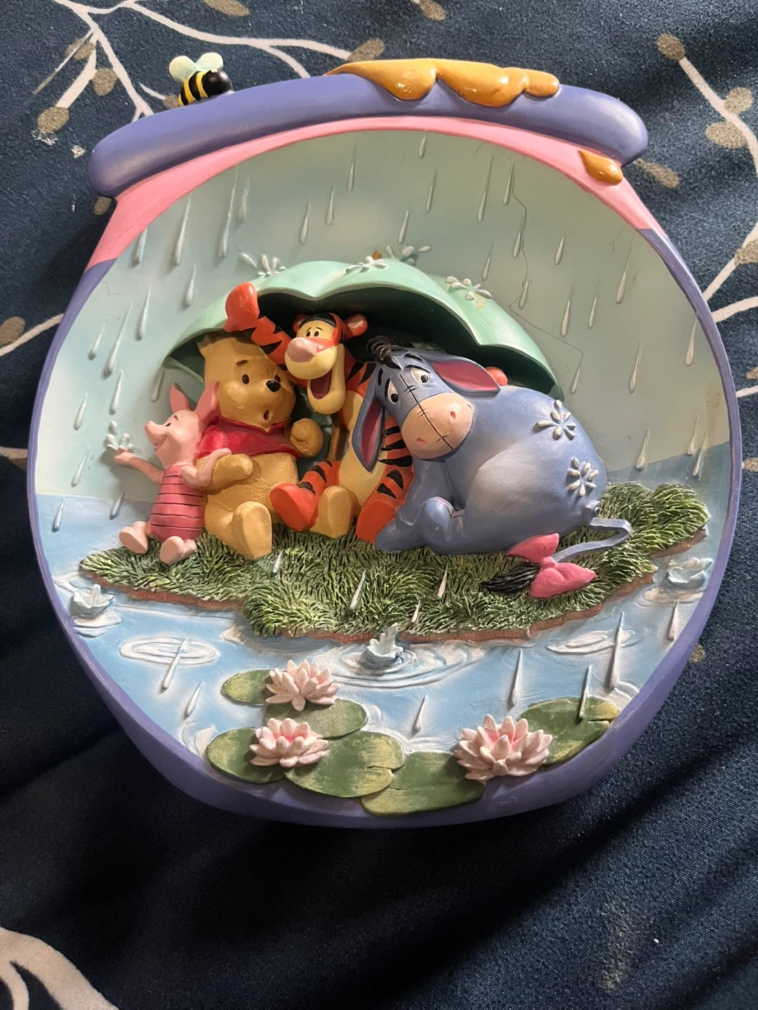 This is the first issue in the Bradford Exchange plate collection, Winnie the Pooh's Hunny Pot Adventures. It's based on the "Winnie the Pooh" works. This limited edition plate closes forever no later than October 31, 1999. It features Winnie the Pooh, Tigger, Piglet, and Eeyore under an umbrella in the rain.