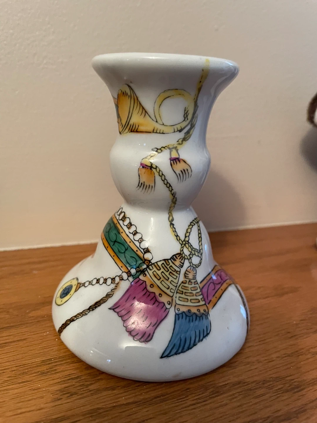 This charming ceramic candlestick holder features a decorative design with colourful tassels and chain accents. It's perfect for adding a touch of vintage flair to your decor. Made of ceramic material.
