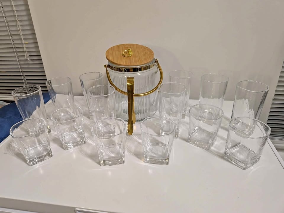 Glass Ice Bucket w/ Lid, Tongs & Handle +8x16oz, 6x13oz Glasses