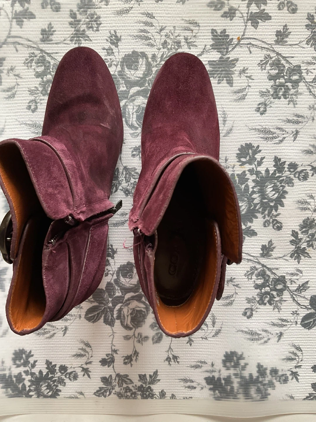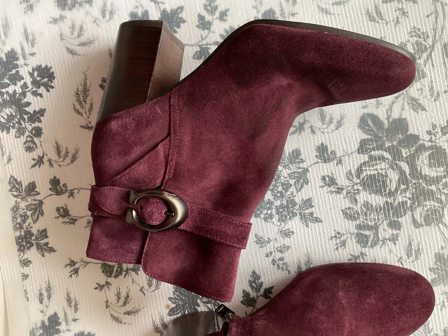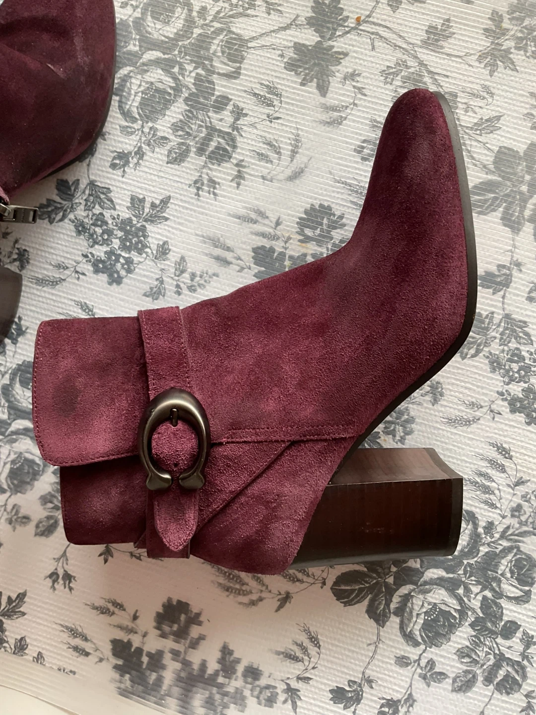 Burgundy suede ankle boots with a block heel. These boots have a side zipper closure and buckle detail. They're made of suede with a leather interior.