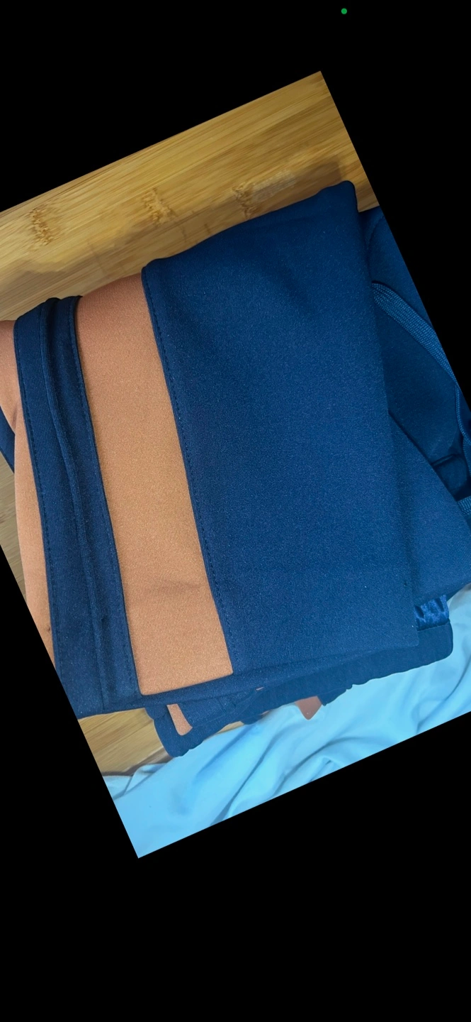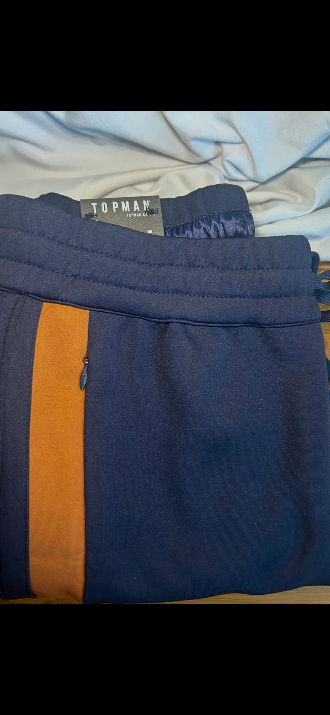 Men's navy blue joggers with orange side stripes. Drawstring waistband. New condition. Size not specified.