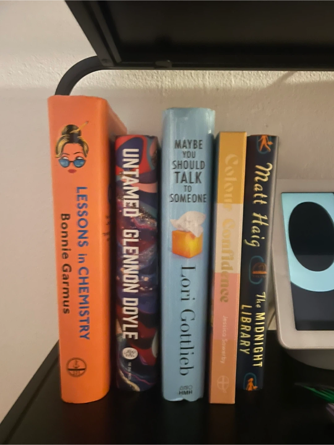 Books include 'Lessons in Chemistry' by Bonnie Garmus, 'Untamed' by Glennon Doyle, 'Maybe You Should Talk to Someone' by Lori Gottlieb, 'Color Confidence' by Jessica Sowerby, and 'The Midnight Library' by Matt Haig. These popular titles cover various themes and are a great addition to any reader's collection.