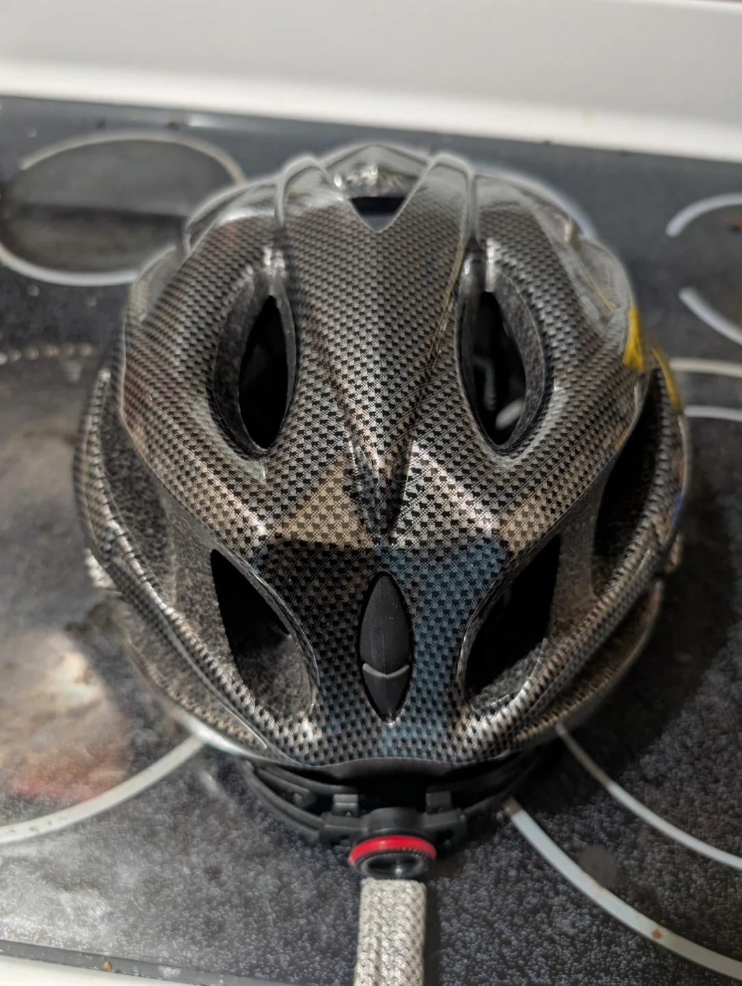 This is a black and silver cycling helmet with a carbon fibre pattern. It features adjustable straps and a dial for a custom fit. It's designed for adult riders. I bought this helmet for a second backup. But never ended up using it.