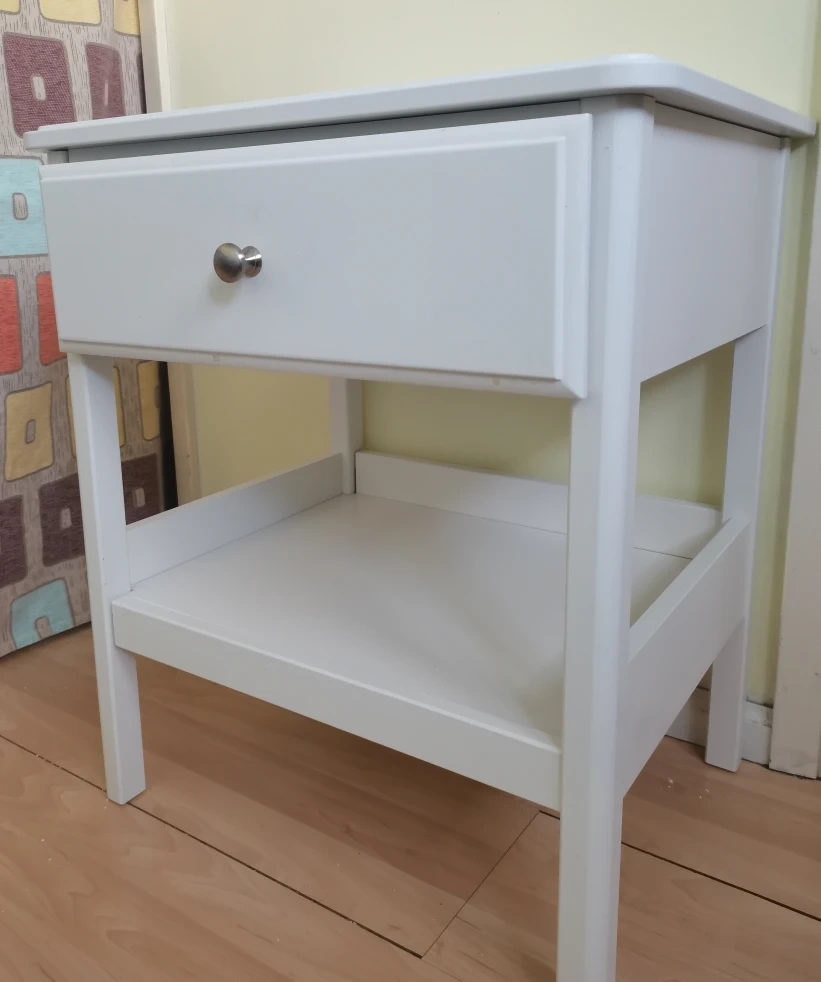 This is a white nightstand with a single drawer and an open shelf below. It's made of a wood composite material. The drawer has a brushed nickel knob. It's a handy piece for your bedroom!