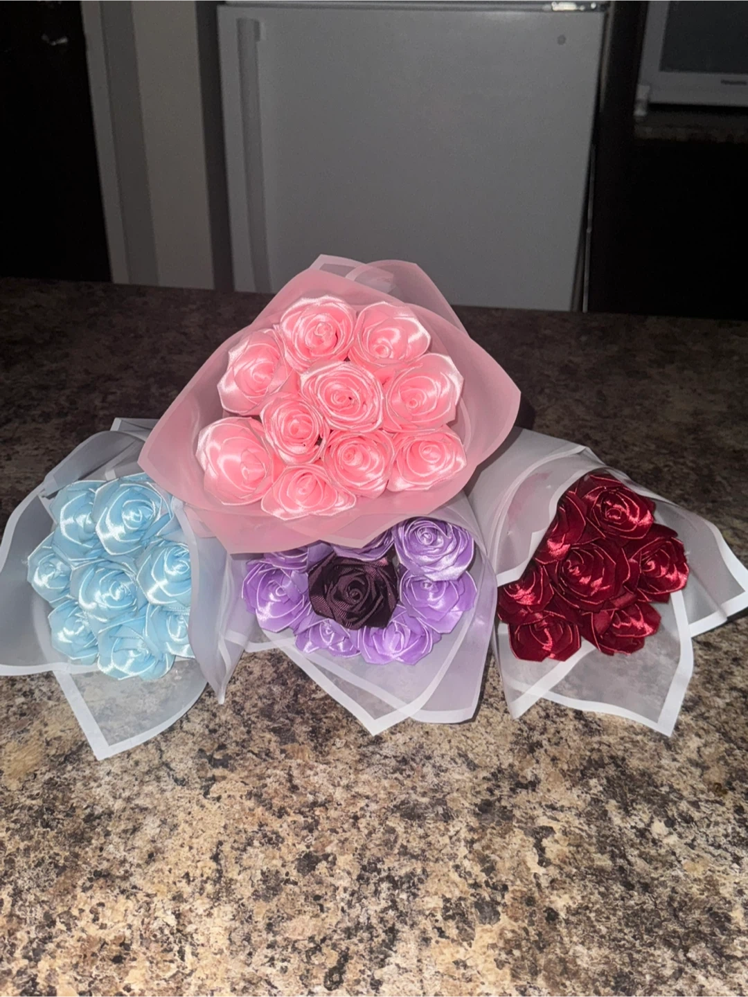 A set of decorative bouquets featuring satin roses in various colours. Each bouquet is neatly wrapped in sheer fabric. They're nice for adding a pop of colour or for crafting projects.