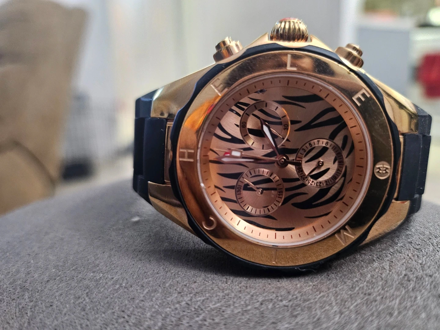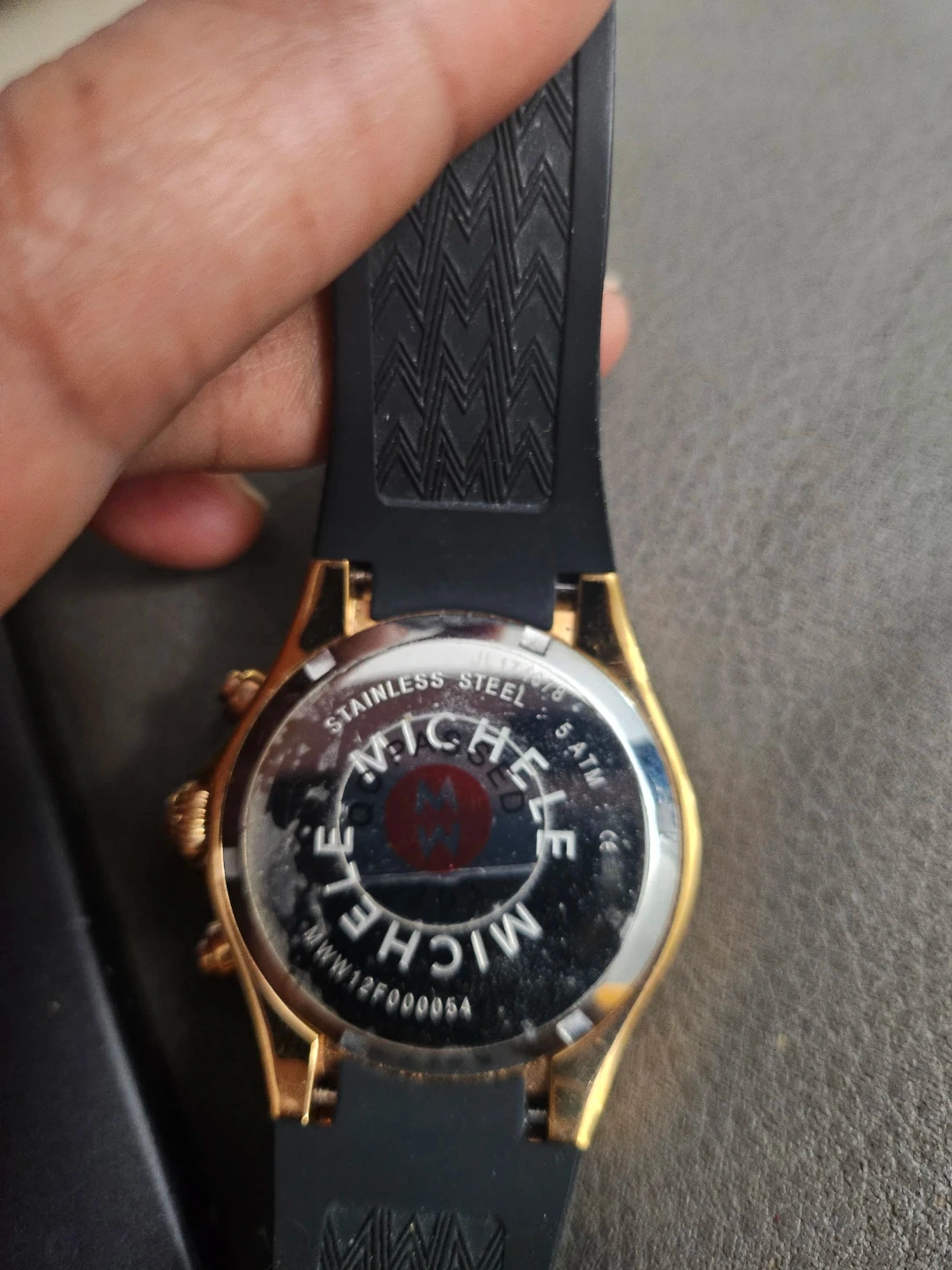 Selling a Michele watch with a unique tiger print face! The band is black and the case is gold-toned. The back of the watch indicates it's made of stainless steel and is water resistant up to 5 ATM