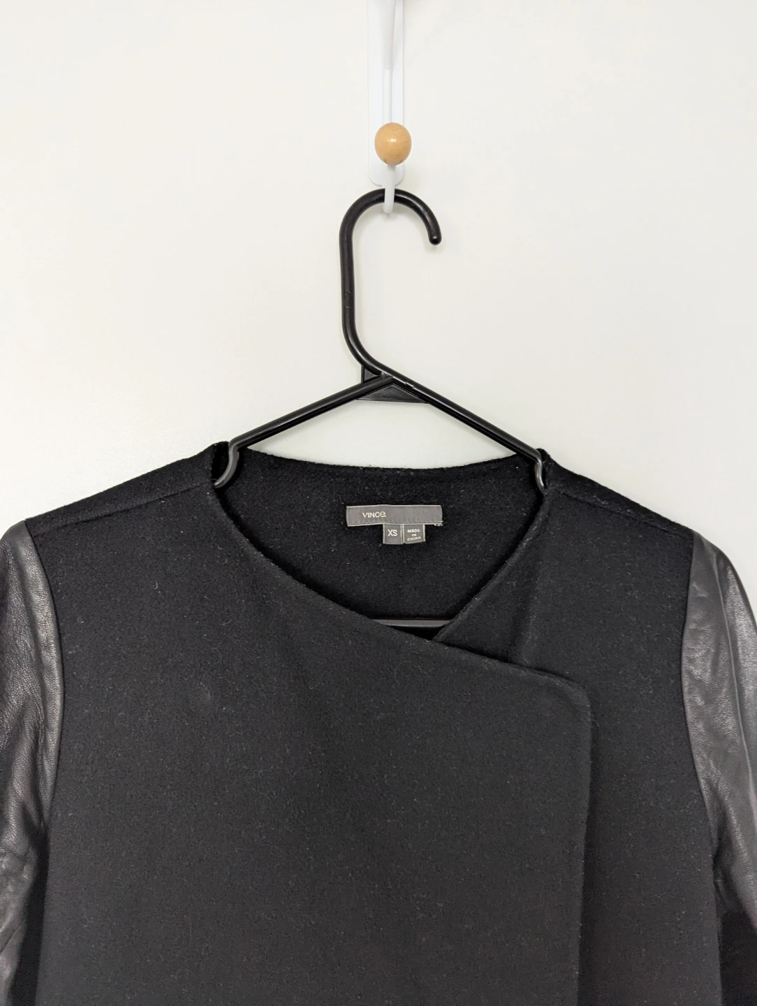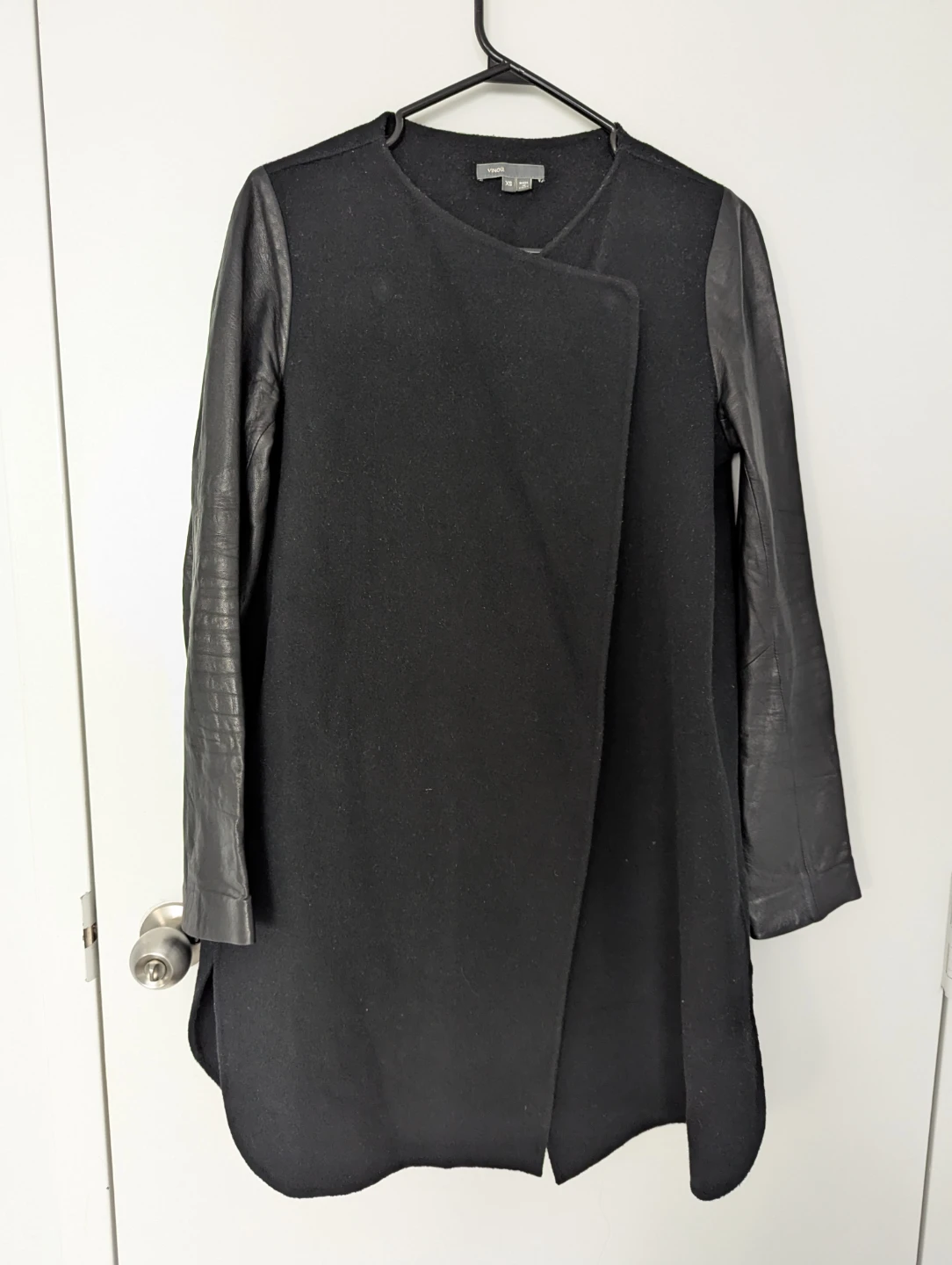 This is a stylish Vince black wool coat with leather sleeves in size XS. It is in good condition, perfect for adding a touch of edgy sophistication to any outfit.