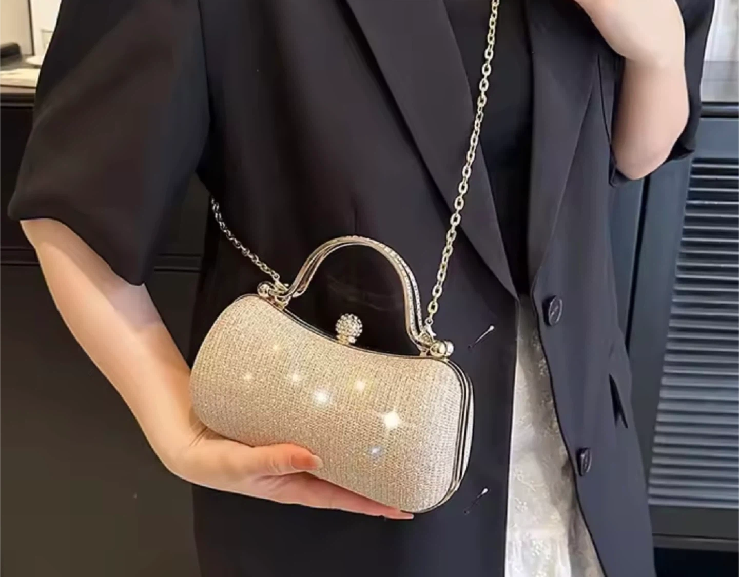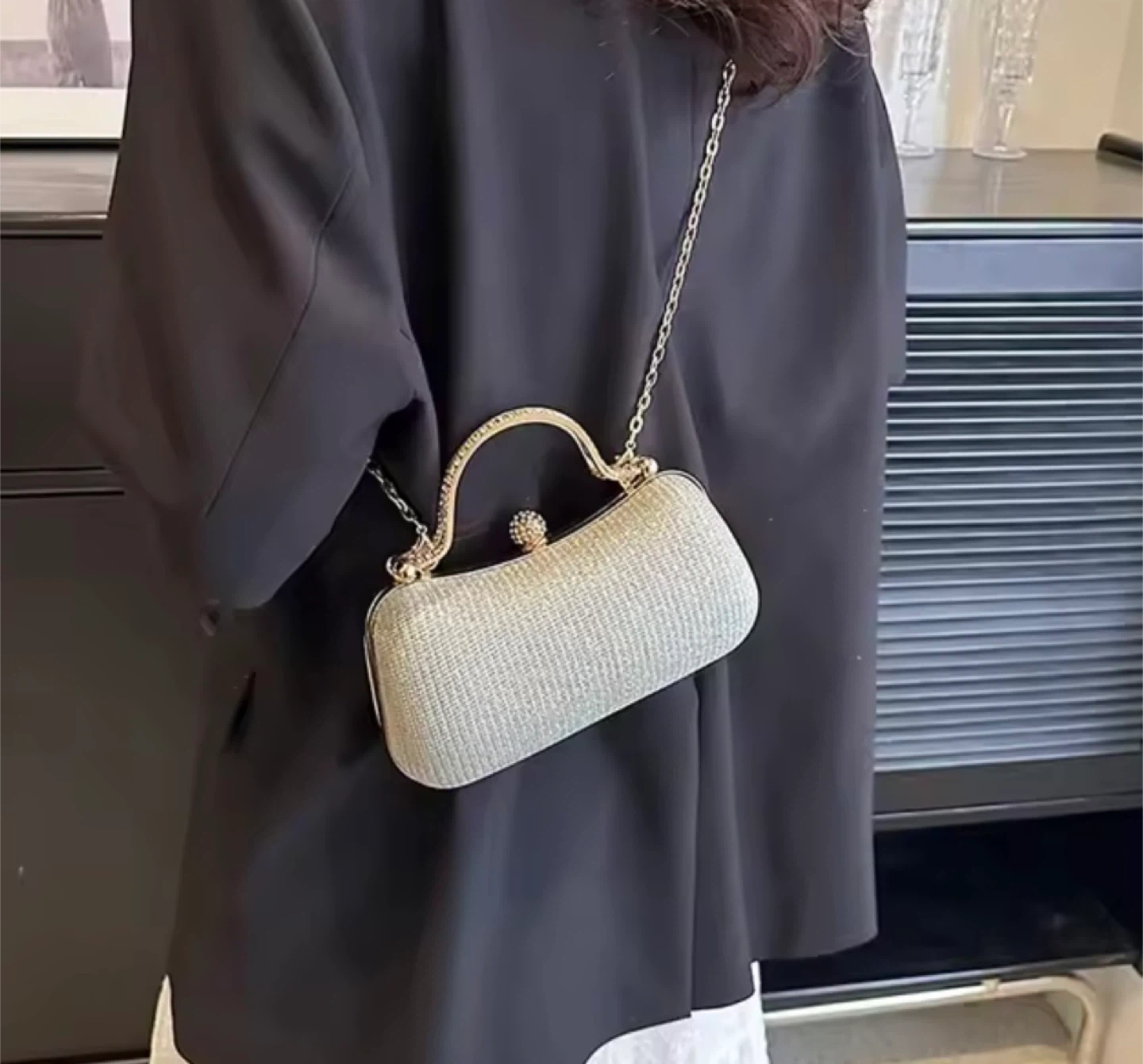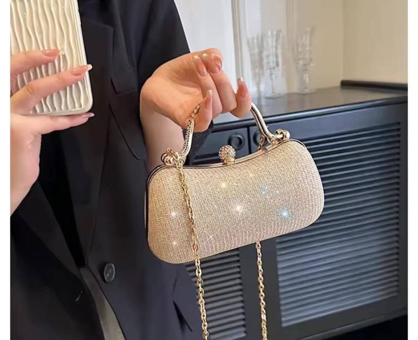 This is a beautiful gold evening clutch, perfect for a special occasion! It has a chain strap for easy carrying. The clutch is in great condition and ready to add a touch of sparkle to your outfit