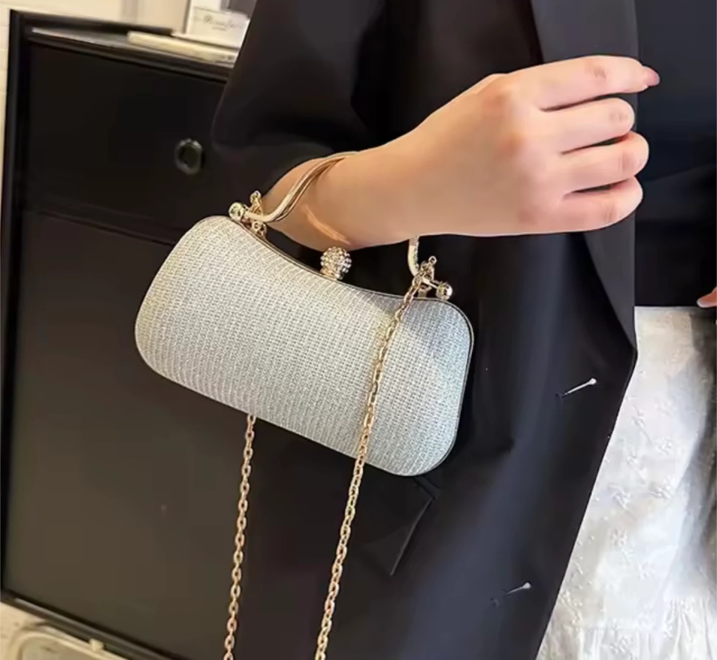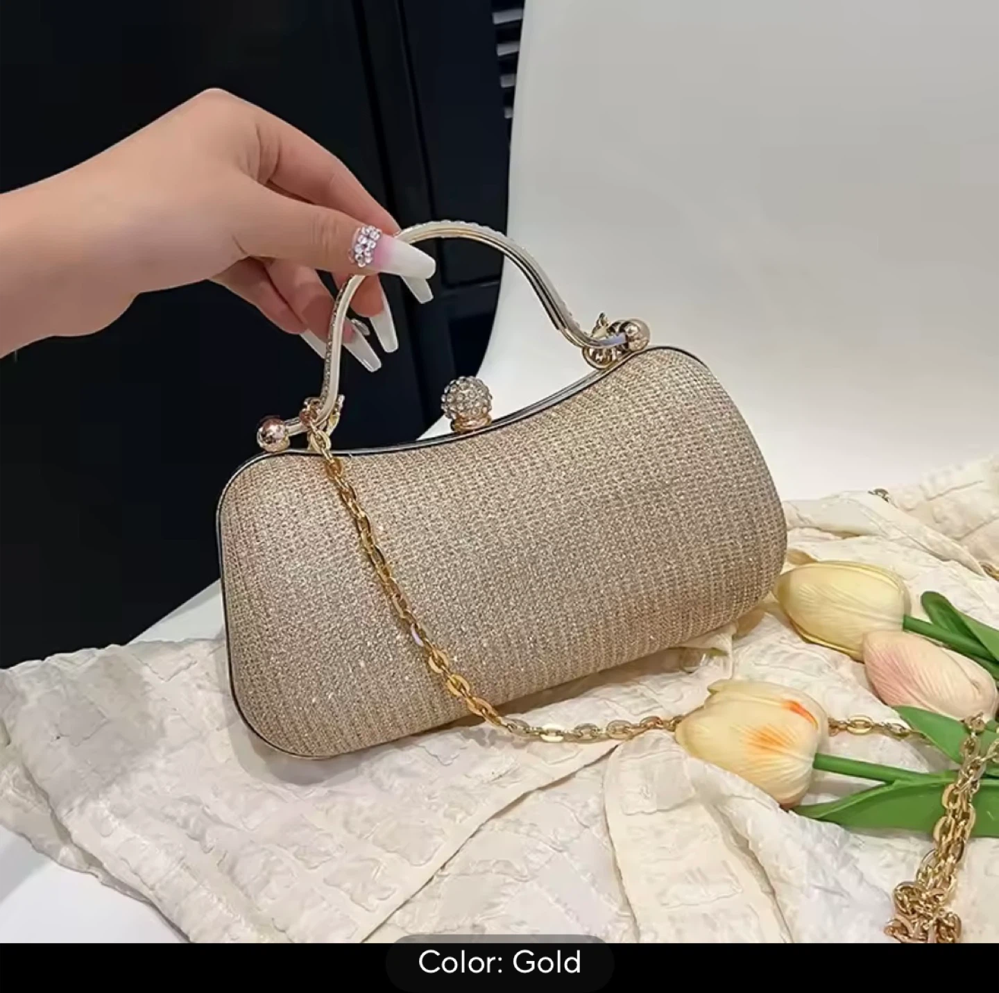 This is a beautiful gold evening clutch, perfect for a special occasion! It has a chain strap for easy carrying. The clutch is in great condition and ready to add a touch of sparkle to your outfit