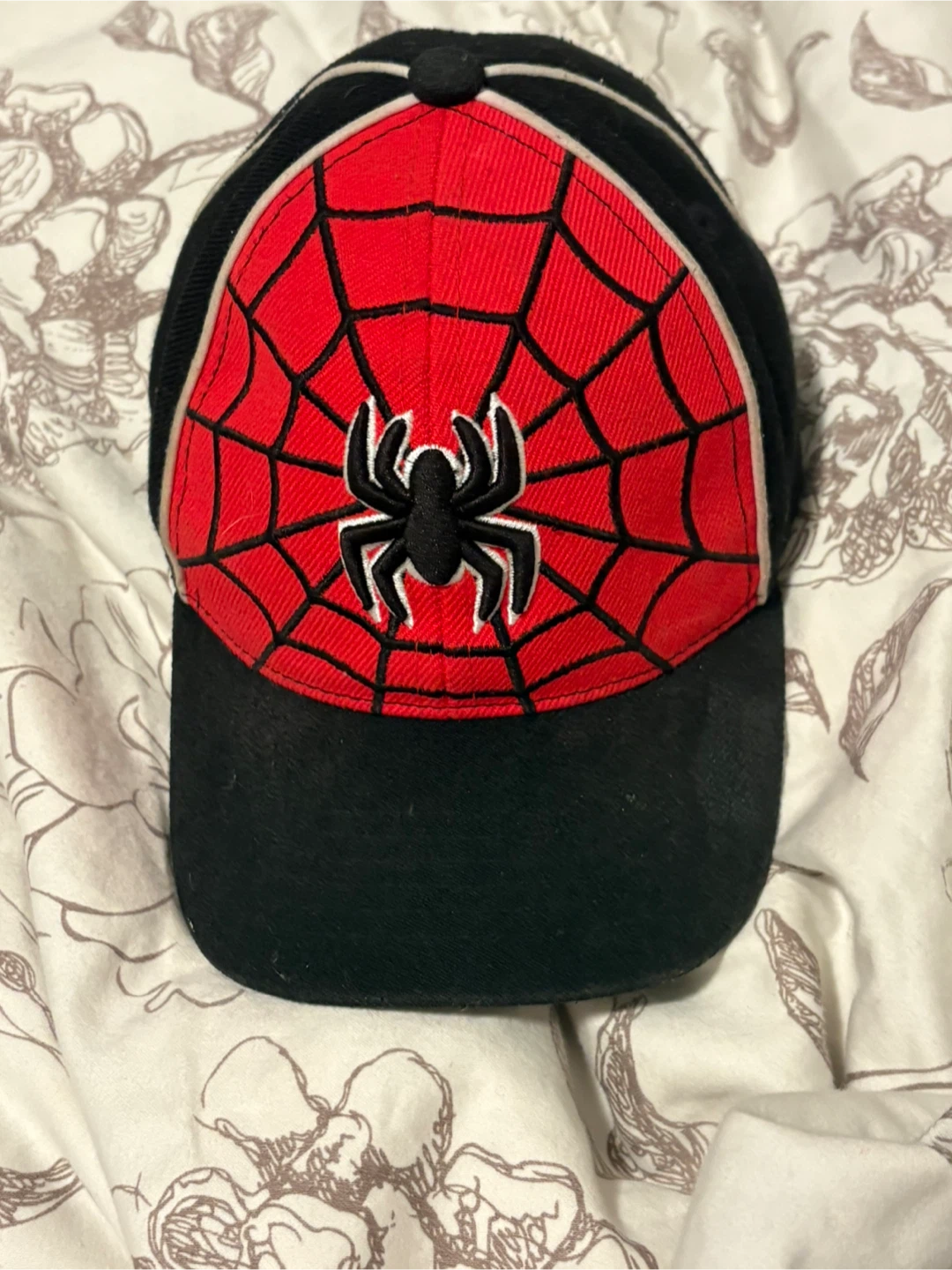 This is a black and red baseball cap featuring a Spidey web design and embroidered spider. It's a fun accessory for any Marvel fan! Made of durable fabric.