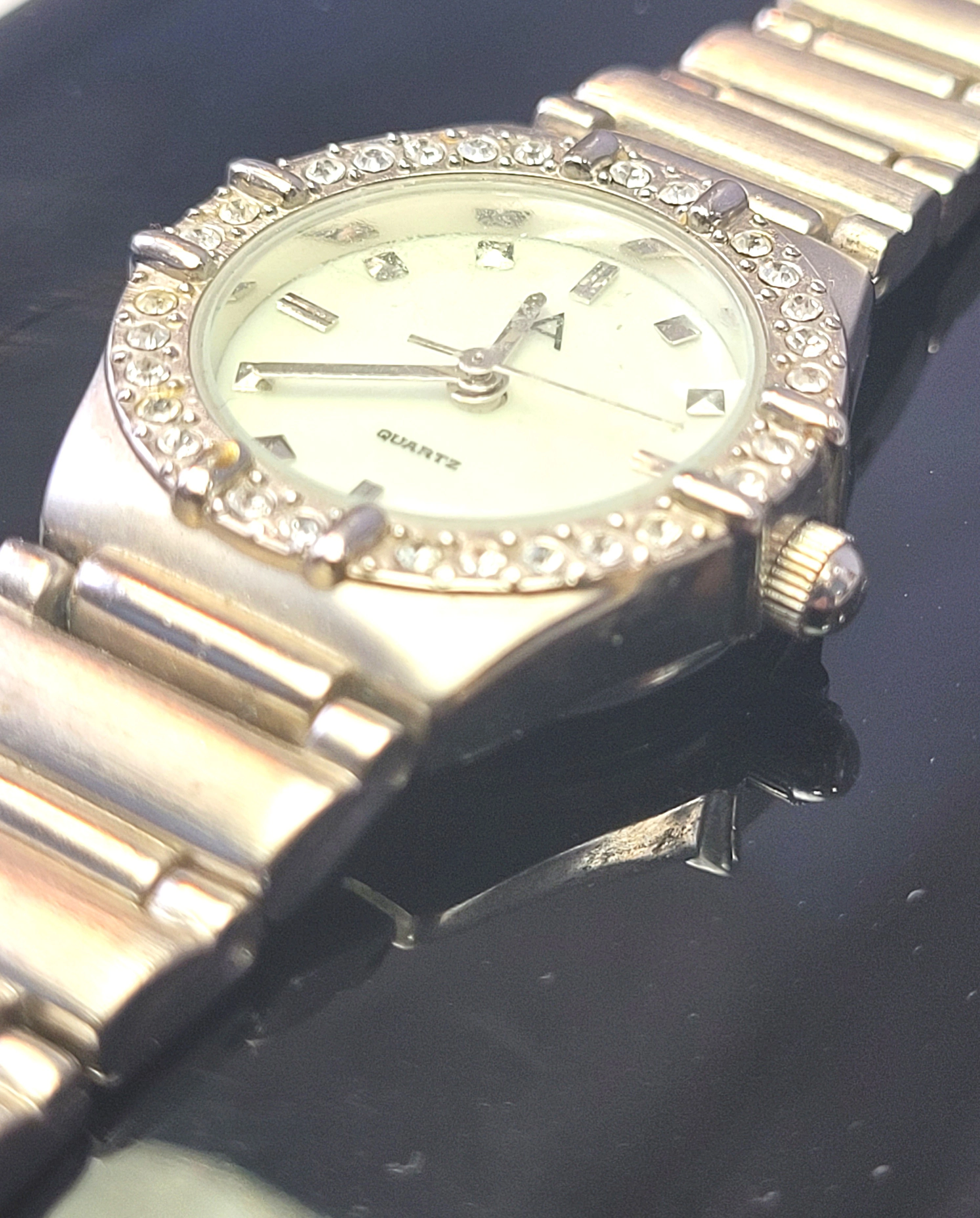 A classic and elegant Advance ladies' dress watch, featuring a stunning crystal-encrusted bezel and a high-polish silver-tone finish. This timepiece is fully functional, featuring a reliable Japanese quartz movement and a brand-new battery recently installed.