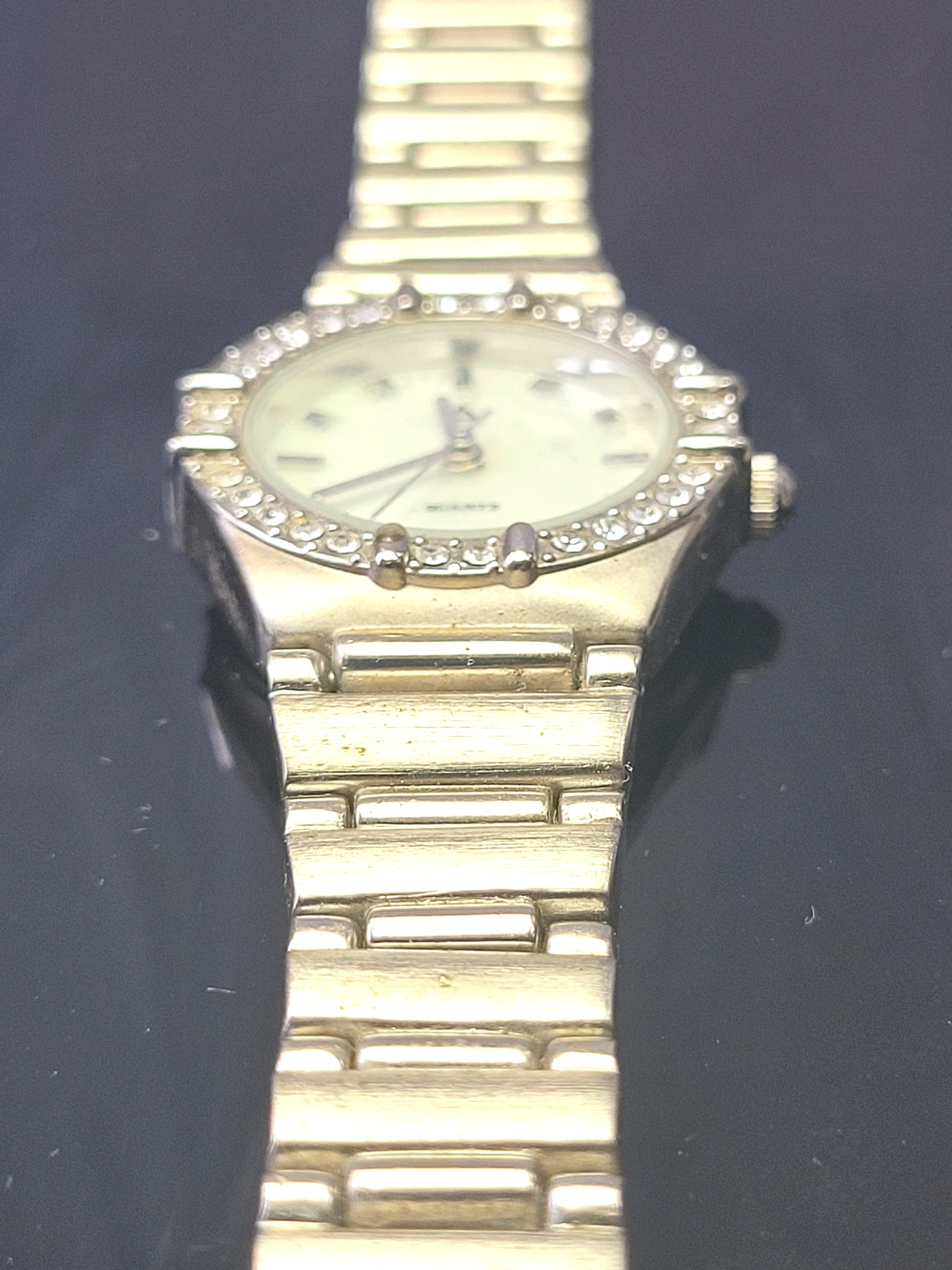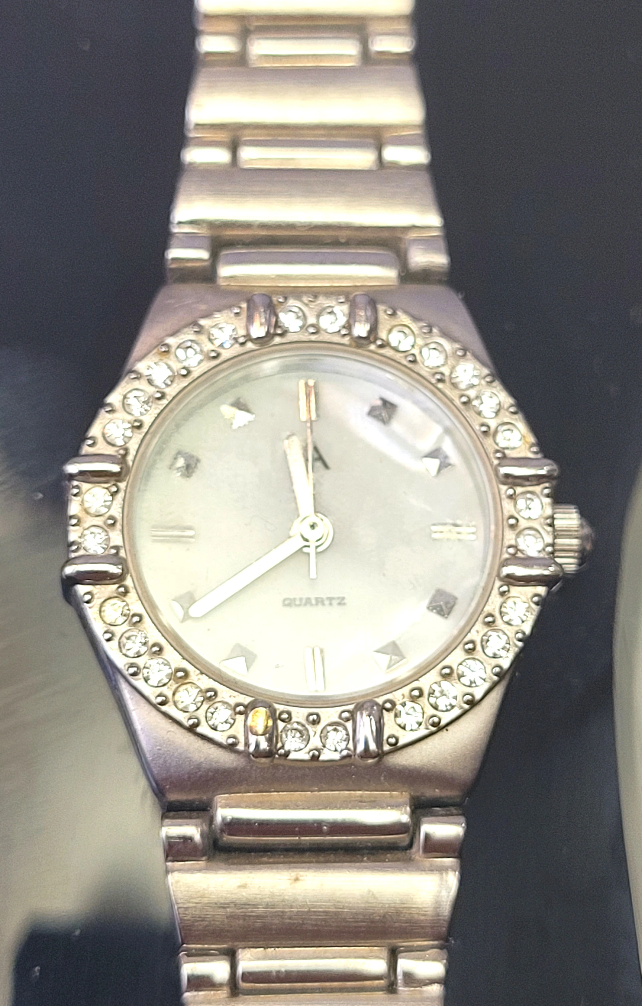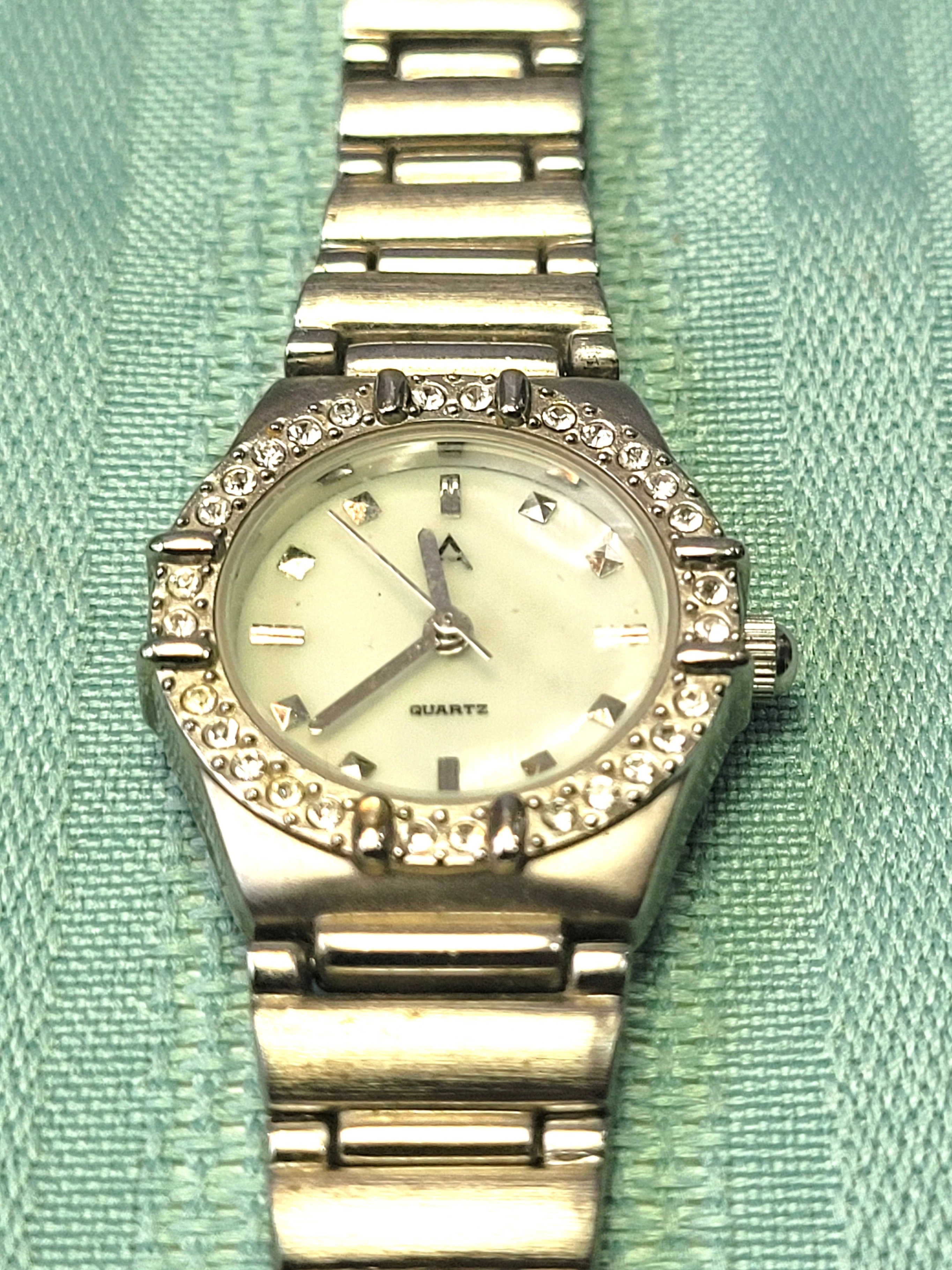 The watch is in good vintage condition with light wear consistent with age. There are minor surface scuffs on the band and case back, but the crystal face is clear and all decorative stones remain intact and bright. Tested and keeping accurate time.