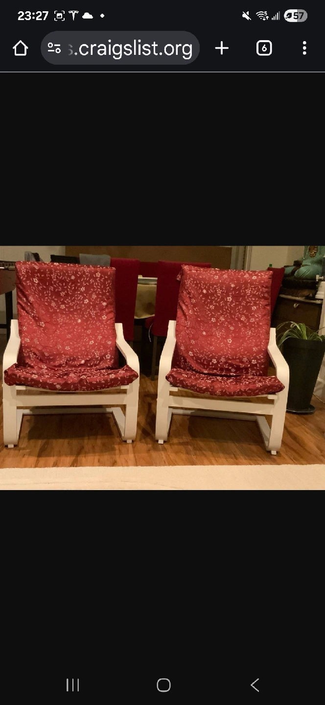 Selling a pair of rocking chairs with red patterned cushions. They have a white wooden frame and look great in any room. Perfect for relaxing!. Armchairs for quick sale for only $120 for both. Please inquire. 672 514 6815