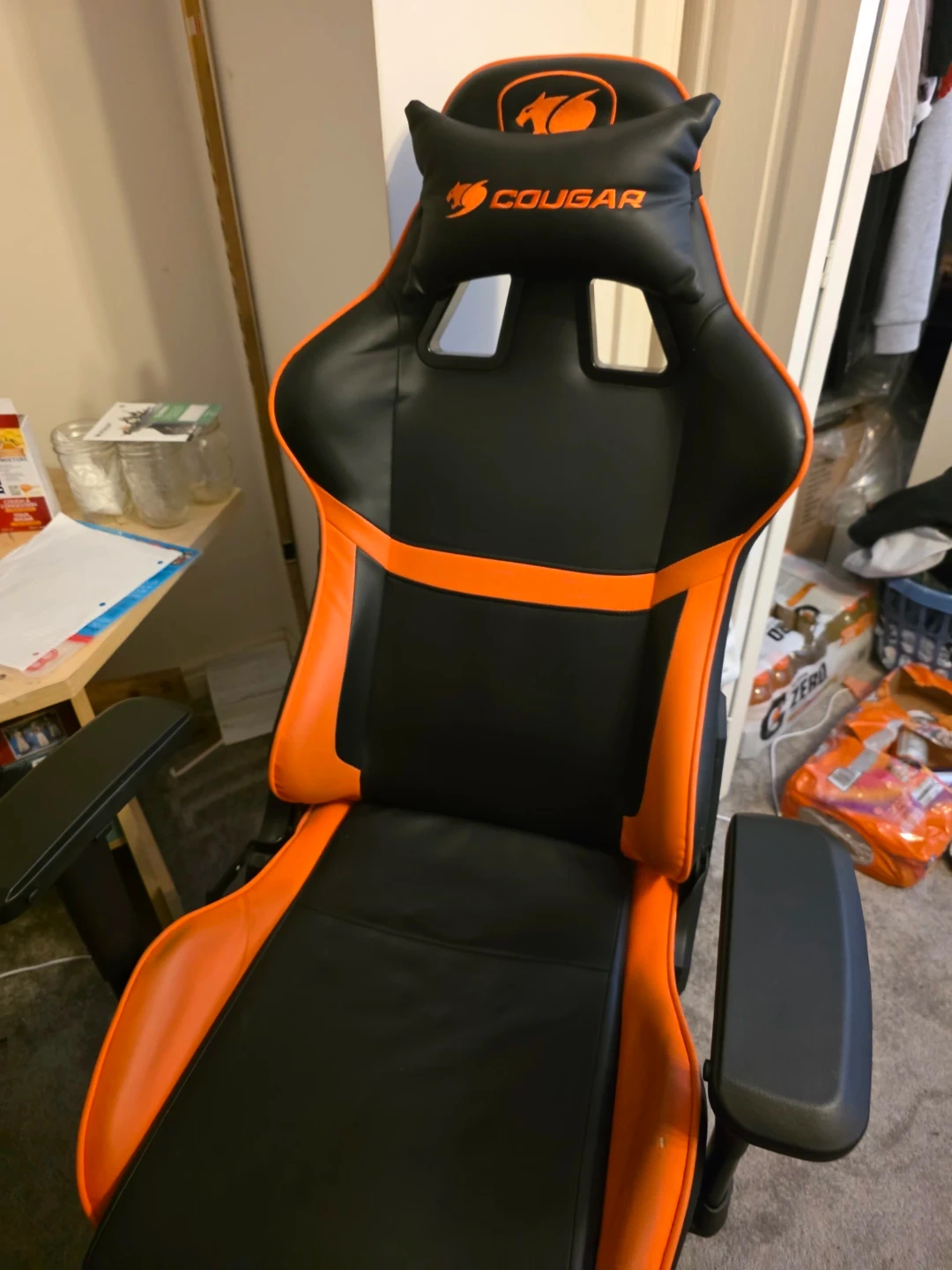This is a black and orange Cougar gaming chair. It's designed for comfort during long gaming sessions. The chair features adjustable armrests and lumbar support.