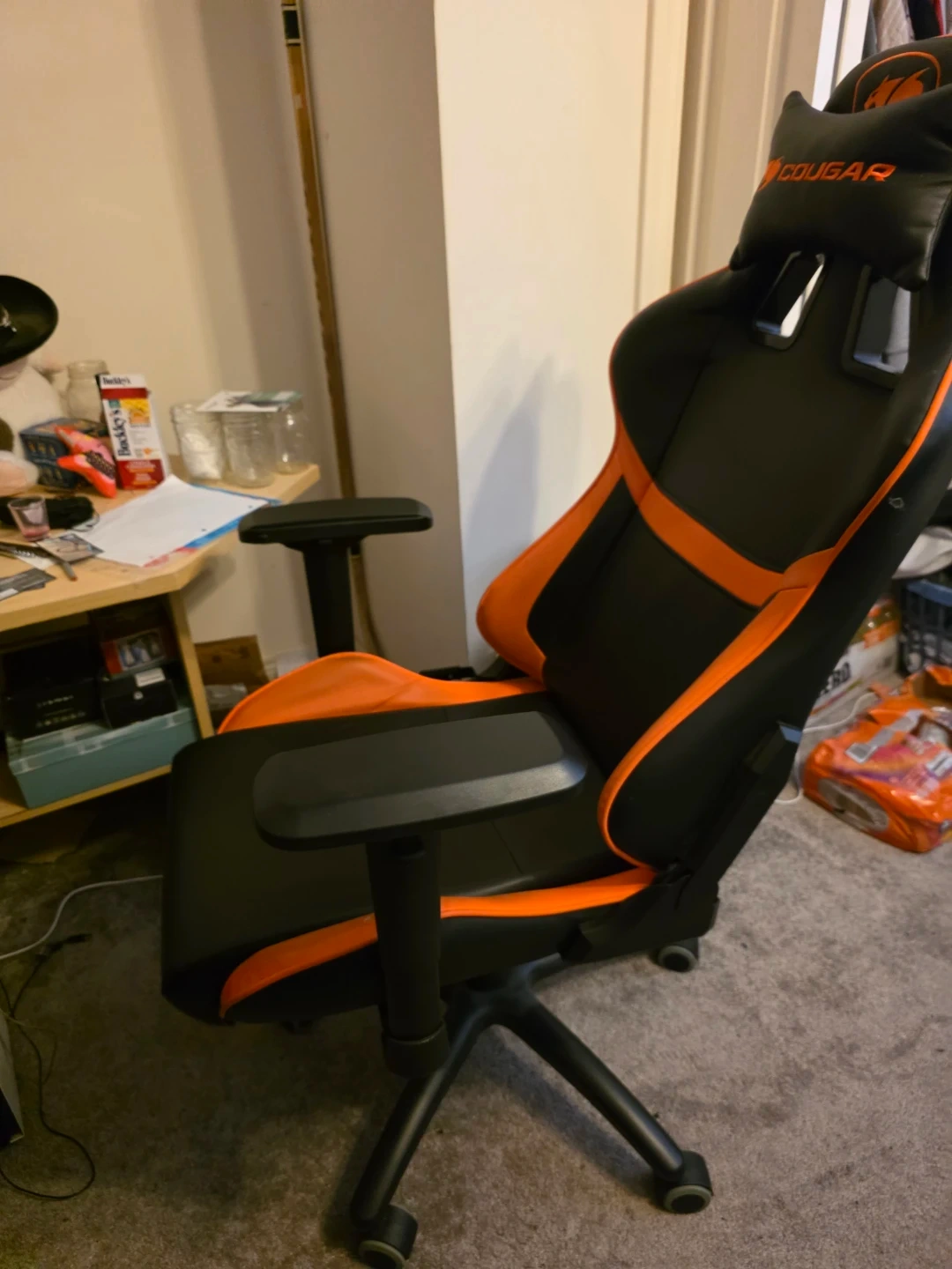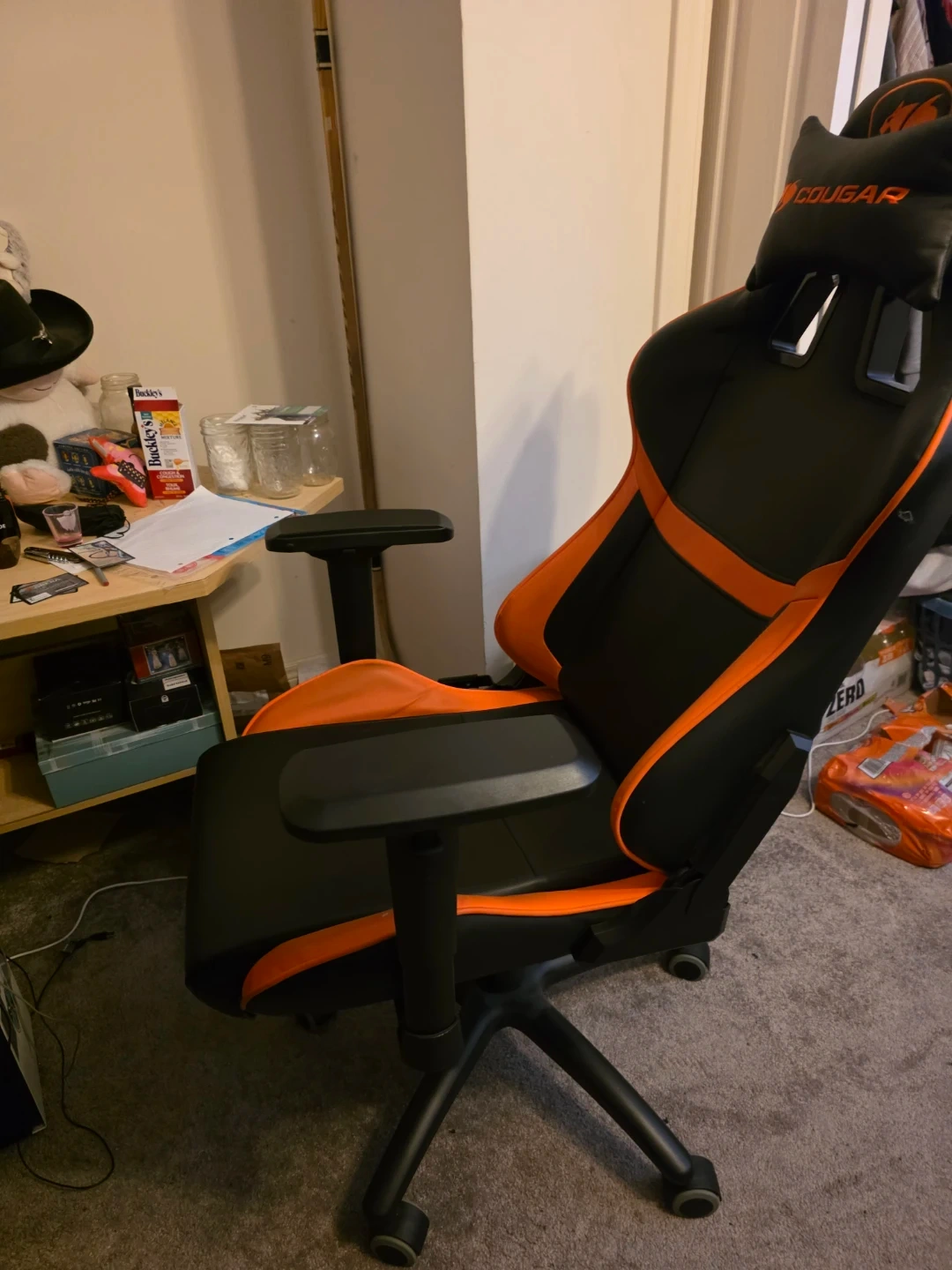 This is a black and orange Cougar gaming chair. It's designed for comfort during long gaming sessions. The chair features adjustable armrests and lumbar support.